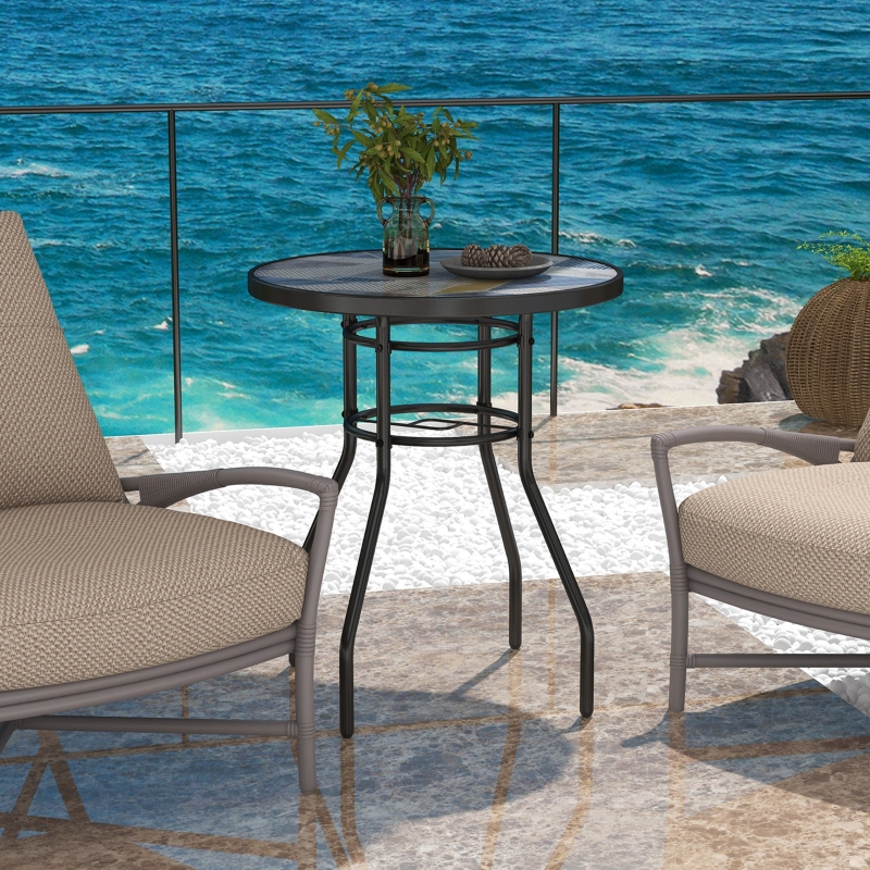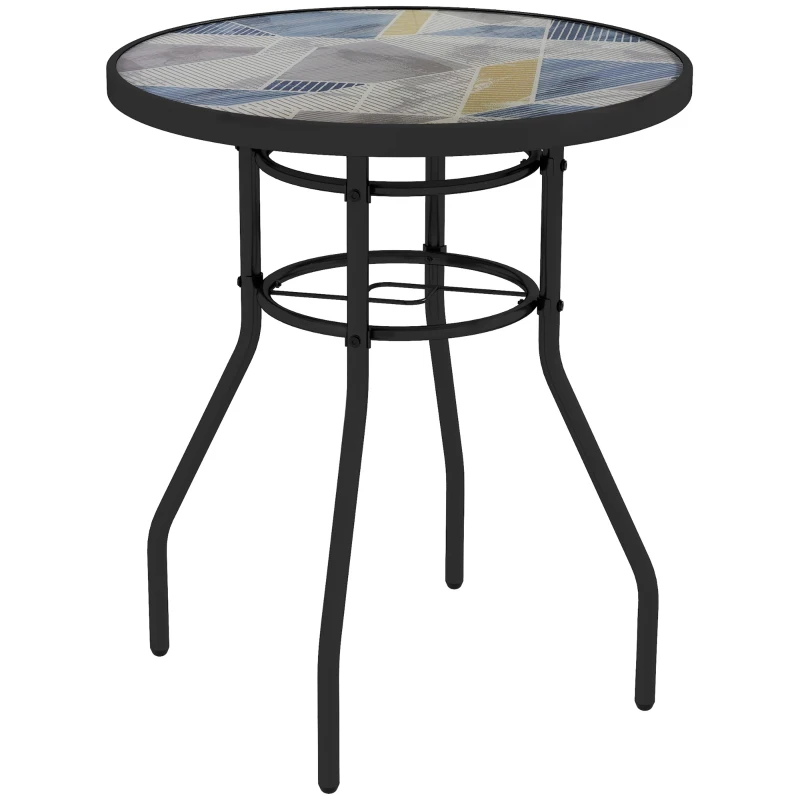 Glass printed tabletop: Patio table brings subtle pattern into your outdoor space, in a unique way. || Steel frame: Powder coated for extra strength, bistro table has a tough and strong core. || Easy to clean: Tempered glass is smooth wipes clean easily. || Protective footpads: Four legs with pads keep chair balanced and steady. || Dimensions: Φ60 x 70Hcm. Maximum load 70kg. Assembly required.