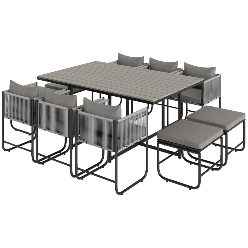 Eleven-piece set: Includes six armchairs, four stools and a large wood-effect plastic top dining table, bringing the whole family together for outdoor dining times. || Comfortable: Chairs come with soft padded seats and back cushions for extra comfort and support. Fixing straps to secure the chair. || Steel, wrapped in rattan: A strong core for each piece. Plastic wicker for a beautiful garden look, in a stringed finish: something different and stylish. || Space-saving design: Chairs and footstools tuck neatly under the table – no getting in the way when not being used. || Dimensions: Chair: 67H x 50.5W x 49.5Dcm. Footstool: 39H x 45W x 40Dcm. Table: 75H x 165L x 110Wcm. Maximum load: Chair: 120kg. Footstool: 100kg. Table: 70kg. Assembly required.