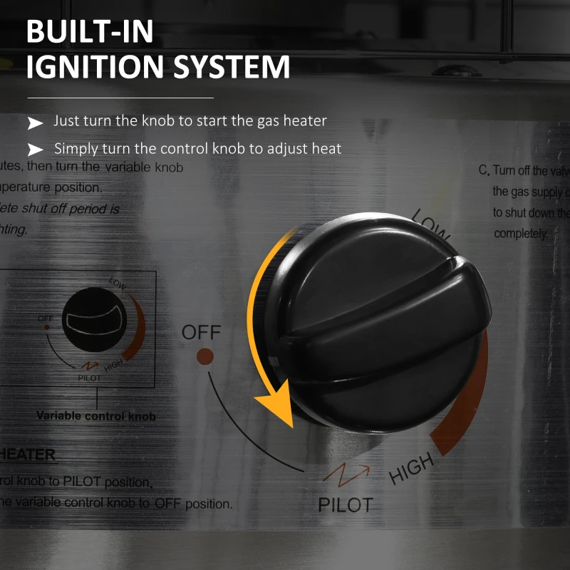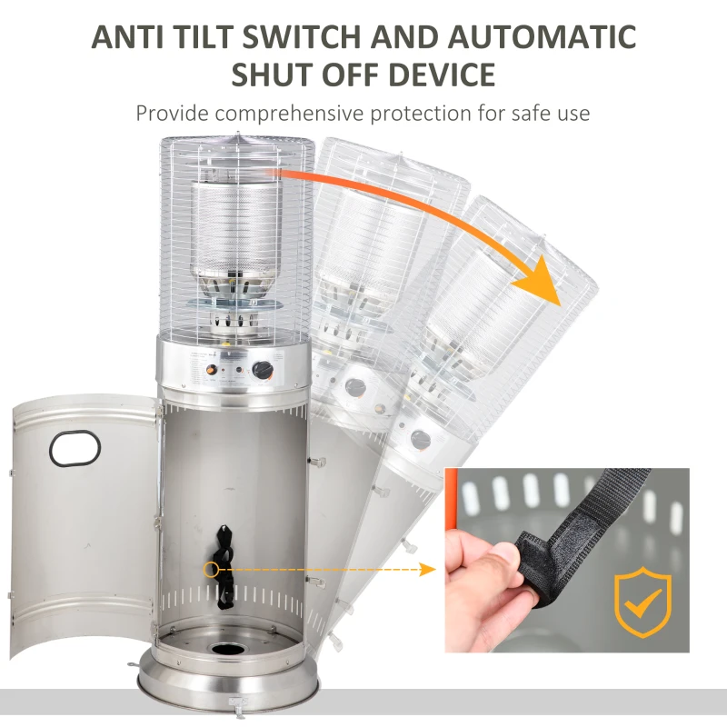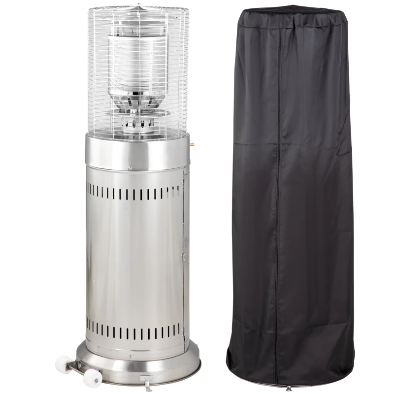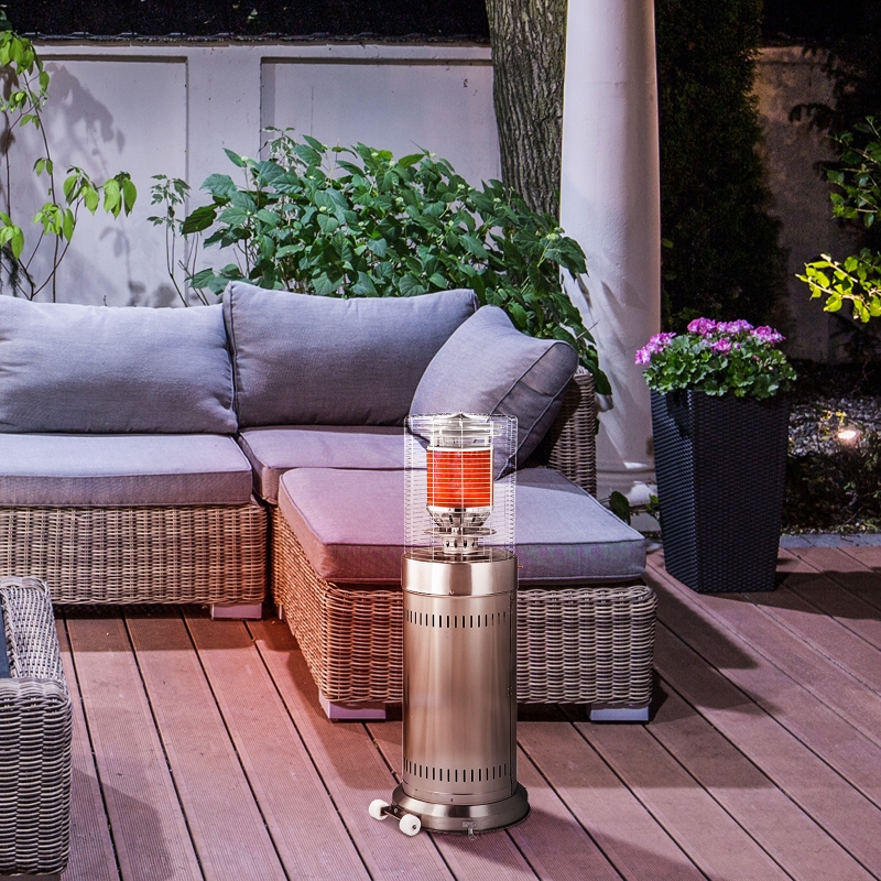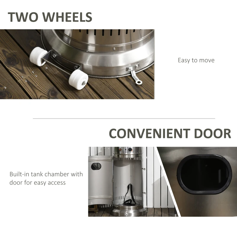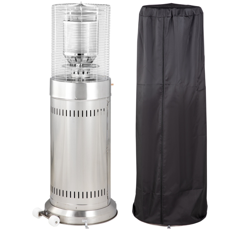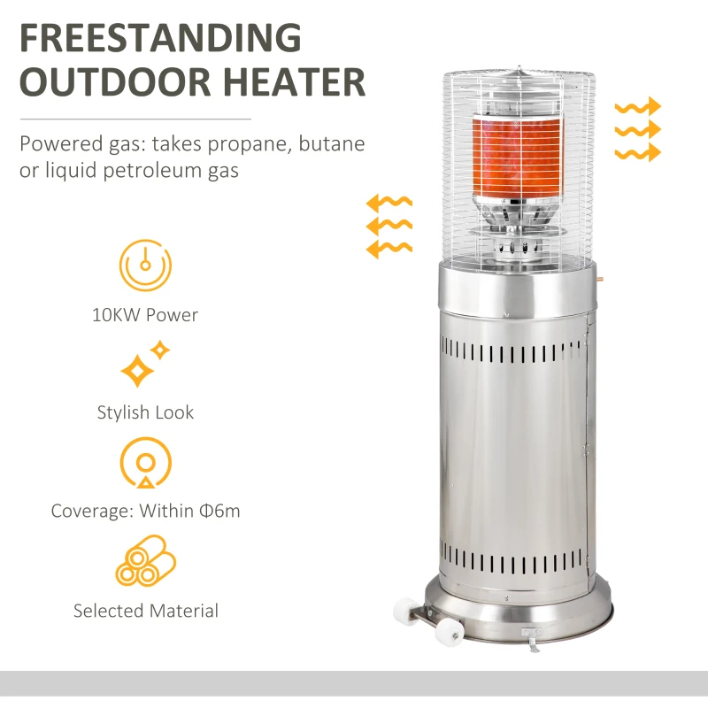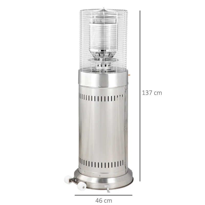 10kW power, with low/high heat setting: Cosy output, set to the setting best for you. Works within a 6m range distance. || Freestanding: Use this outdoor gas heater is plenty of places – bringing heat to where you want to relax outdoors. Great for gardens, balconies and terraces. || Stylish stainless steel body: Durable and tough, it’s suitable for outdoor use. Handle and two bottom wheels on this gas outdoor heater to move around easily. || Safe: Cover to protect heat output when outdoor heater is not being used. Automatic safety shut off. || Dimensions: 137H x Φ46cm. Maximum cylinder size: Φ33.5 x 60Hcm, with maximum 15kg load weight. Hose and regulator included. Assembly required.