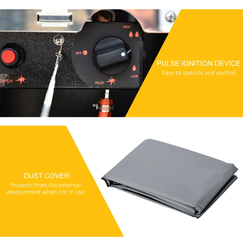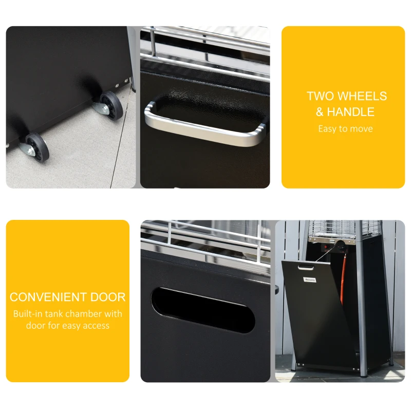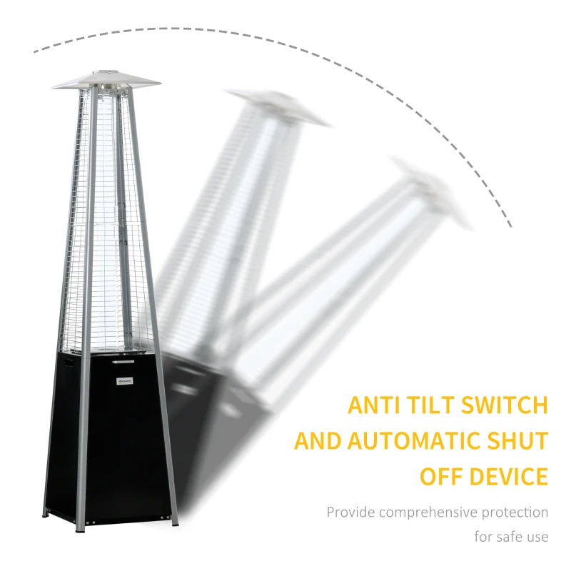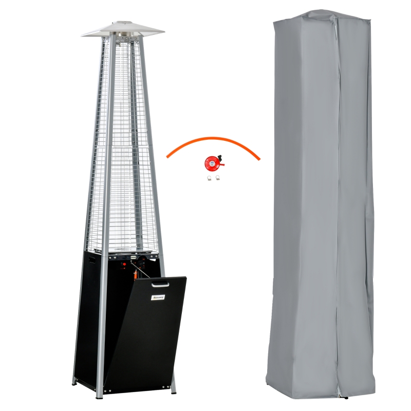 Low/High Heat Setting: 11.2kw, the gas patio heaters are easy to have the heat at a temperature which is most suitable for you. Practical for both warmer and colder evenings outdoors, where keeping warm is still wanted. The garden heaters are easy to control by pulse ignition. || Stylish and Safe: A beautiful and bold pyramid design which will look good anywhere – the garden, the patio, terrace or balcony. Glass tube of the outdoor heater protects you against the flame, with an anti-tilt switch and automatic safety shut off switch. || Metal Body: The outdoor heaters for home are tough and durable, suitable for mild outdoor use. Pyramid shape for balance. The patio gas heaters feature two wheels and handles to move easily. || Cover Included: Protects the propane gas heaters from damage when not being used. || Hose and Regulator Included. Assembly Required. Maximum Cylinder Size: Φ32 x 60Hcm, Maximum Cylinder Capacity: 13kg (Cylinder not included). Gas Consumption: 815g/h. Thermal Efficiency: 38000BTU.