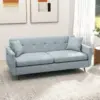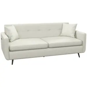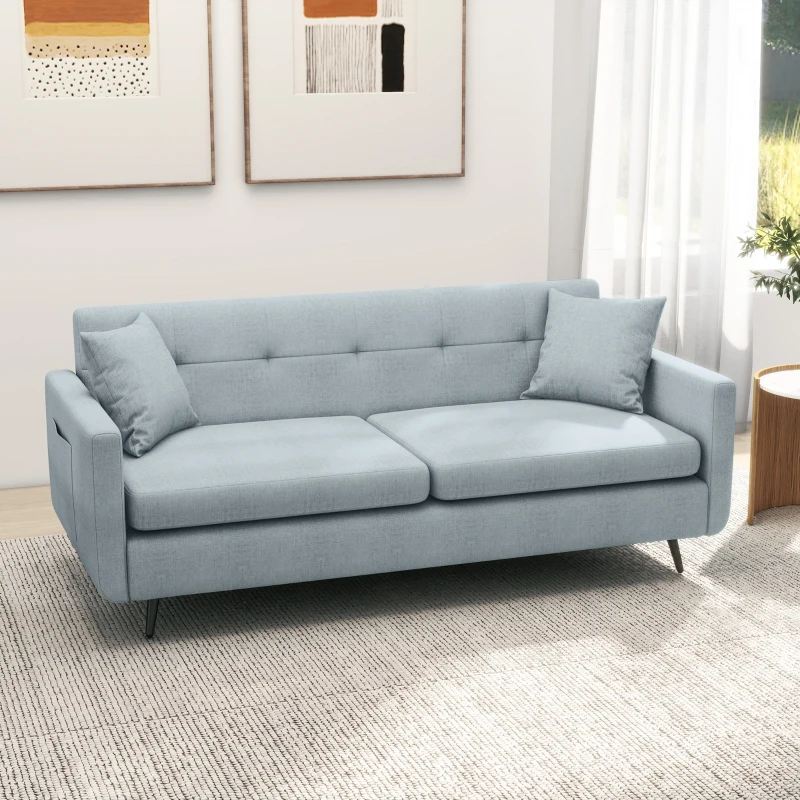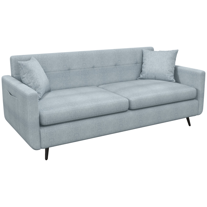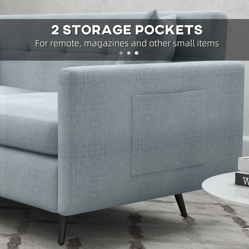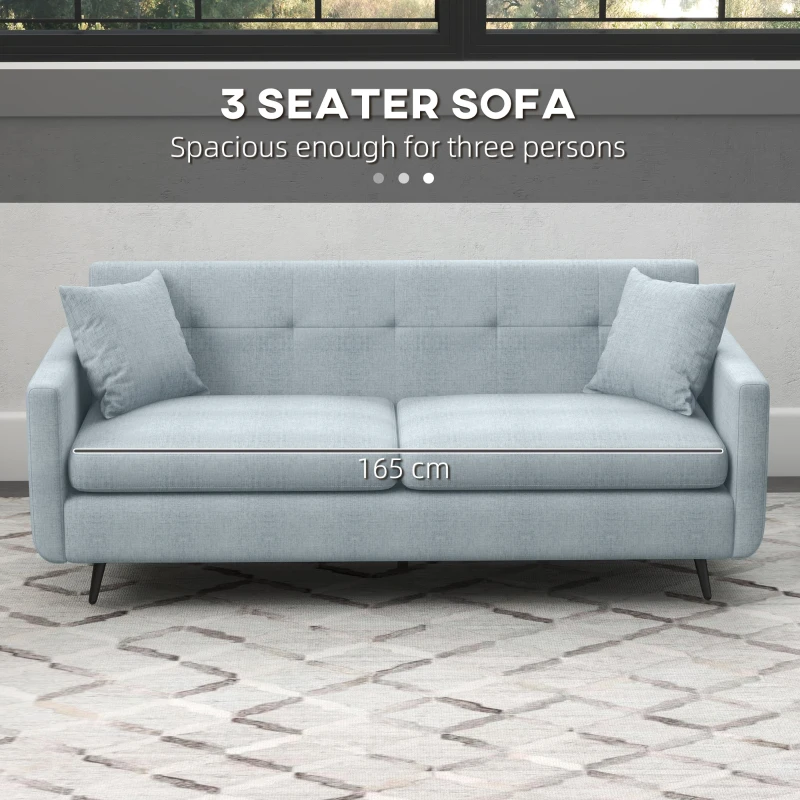 Three-seater sofa: Relax on this small sofa with company. 165cm wide – compact enough to fit into smaller spaces, such as bedrooms, studio apartments and offices. || Comfortable: Small couch is padded to sink into, with smooth linen-look upholstery. Inside springs help retain the bounce. Two cushions included for extra comfort and support. || Powder coated steel legs: A strong, supportive base for this small couch – keeping you steady as you relax. || Two side pockets: Keep smaller items in this home office sofa close to you. || Dimensions: 72H x 165W x 73Dcm. Maximum load 250kg. Assembly required. Made from flame retardant materials.