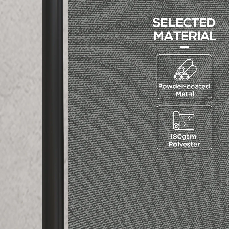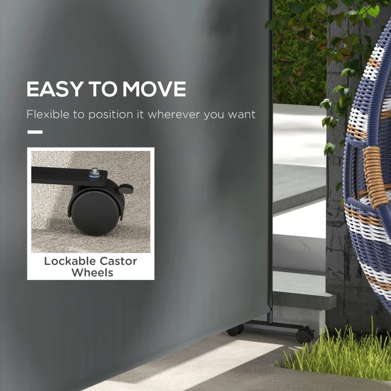 183 x 181cm size: A large garden divider screen, offers plenty of privacy and protection when needed. Shades against sun and wind. || Four wheels: Easy to move and position garden partition screen wherever you want. Brakes to fix in place – be careful on windy days as it will roll around. || Metal frame: Powder coated for extra strength, ensures a strong core for metal garden screen. || 10cm bottom height: Allows gentle air circulation to help decrease wind stress. Lower chances of freestanding garden screen blowing over. || Dimensions: 181H x 183L x 30Wcm. Easy to assemble.