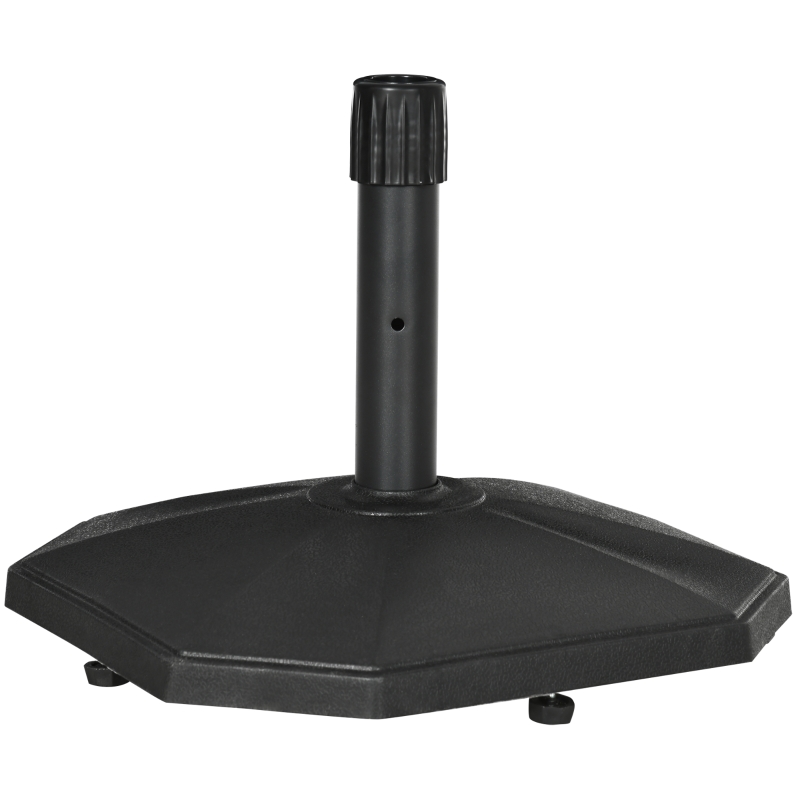 18kg weighted umbrella base, for 34, 38 and 48mm poles: Garden parasol base is suggested for Best skus 84D-004, 84D-005 and 84D-117. Measure pole diameter and weight before purchase. || Plastic shell, with concrete filling: A tough shell, this garden umbrella base is strong inside, to keep parasol standing in place. || Tightening screw: Secure pole in place to this parasol umbrella base. || Powder-coated metal pole: Supports the umbrella steadily while withstanding outdoor elements. || Dimensions: 33H x 45.5L x 45.5Wcm. Pole: 25H x Ф5.2cm. Easy to assemble.