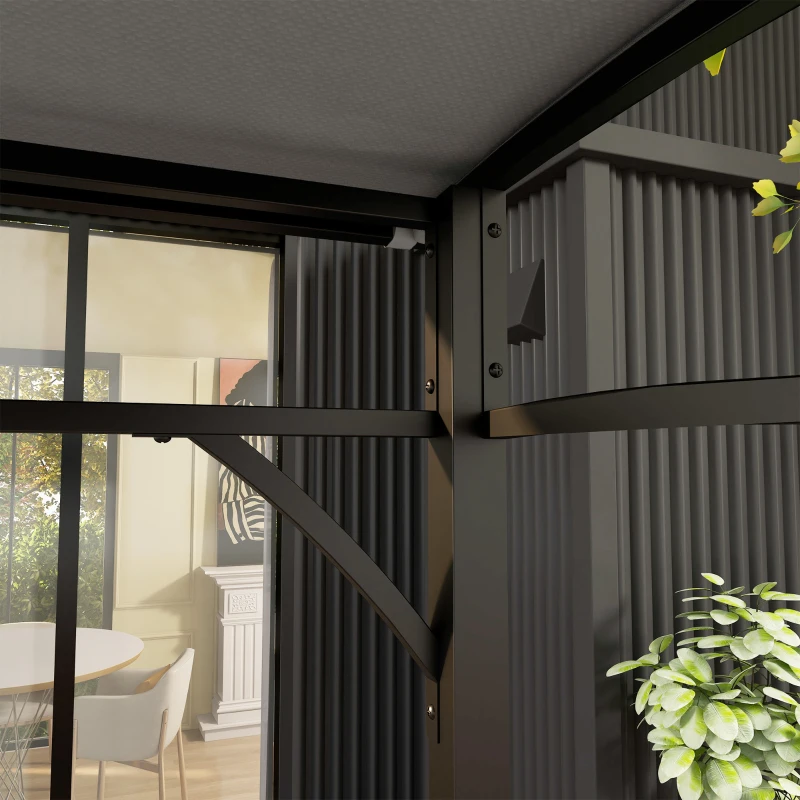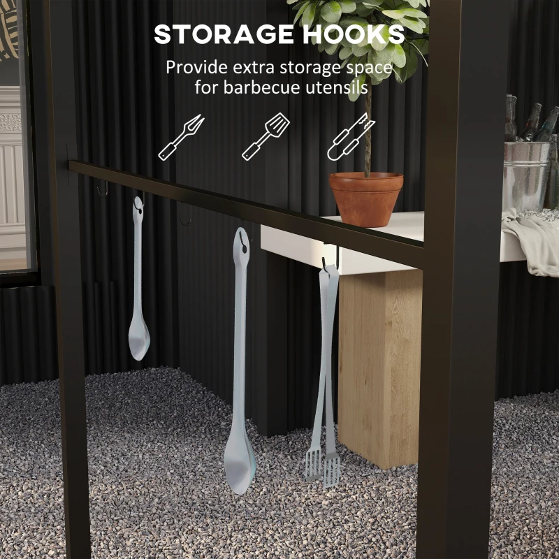 Ten inner hooks: Five on each side of the grill gazebo – handy room for holding utensils, pans and other grill/cooking tools next to you as you cook. || 215cm x 150cm metal frame: Generously sized to give you plenty of room for your BBQ, you and room to move around freely. For grills up to 110cm wide. || Curved canopy: Water-resistant polyester canopy creates safe bbq shelter below against light/medium weather. The outward-facing shape helps with inner airflow, pushing smoke outwards to keep the inside as clear as possible. || Ground stakes included: Pin the structure to the ground, helps keep the bbq gazebo shelter in place. || Dimensions: 215L x 150Wcm. Front: 220Hcm. Back: 182Hcm. Assembly required.