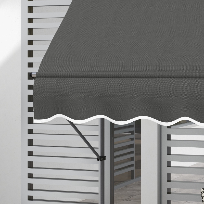 Ceiling to floor: Adjustable pillars, from 2.1m to 3(m). No drilling to avoid wall damage – door canopy can be set up virtually anywhere. || 0-90° adjustable canopy: Controlled by handle, to open the patio awning smoothly and quietly. Adjust to a position of your choice. || UV30+ retractable canopy: Protects you from direct sunlight from above. Helps keep the area cool during summer. || Aluminium and metal blend frame: A strong core, our garden awning stands steady. || Dimensions: 250W x 120Dcm. Installed height: 210-300cm. Assembly required.