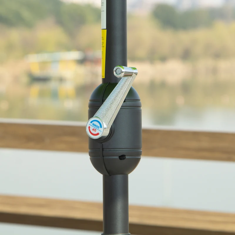 Aluminium pole with glass fibre ribs: Sturdy central core. The Aluminium pole is lightweight and rust-resistant, while the eight glass fibre ribs are not easy to break in windy days. || Tilting parasol: Fix to three different angles to shade against the sun and its rays, through different times of day. || Crank handle: Open and close the large garden umbrella easily with the easy-turn movement. Located on the side of the pole. || Φ2.65M Canopy: Large patio umbrella offers plenty of shade from direct sunlight and light rain. Perfect for gardens, balconies, patios and other uncovered outdoor areas. || Dimensions: 2.4H x Φ2.65m. Pole: Φ38mm. Recommend to use bases heavier than 25kg. Do not leave open in heavy weather. Assembly required.
