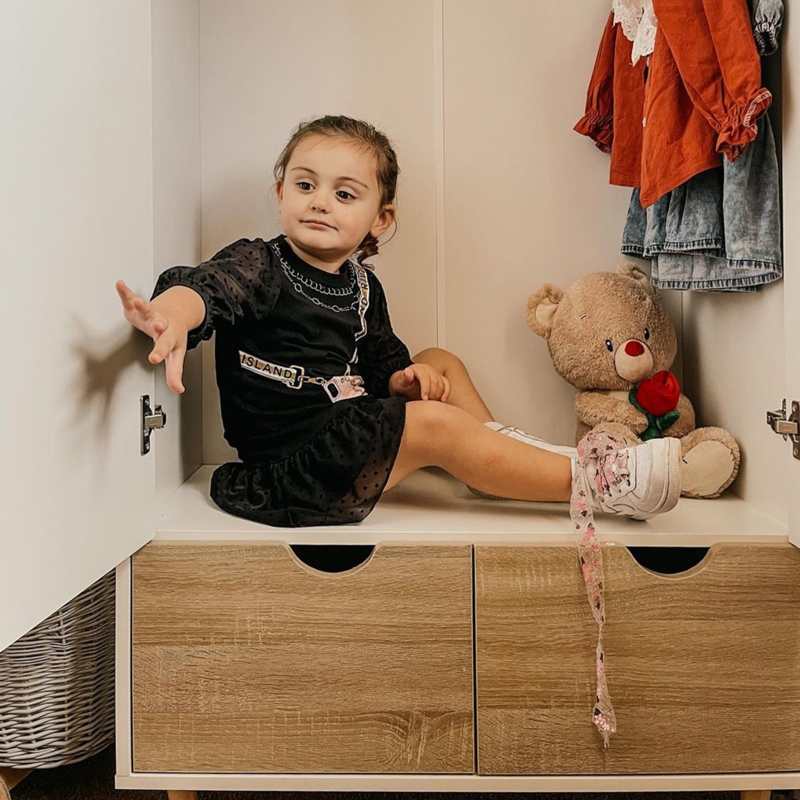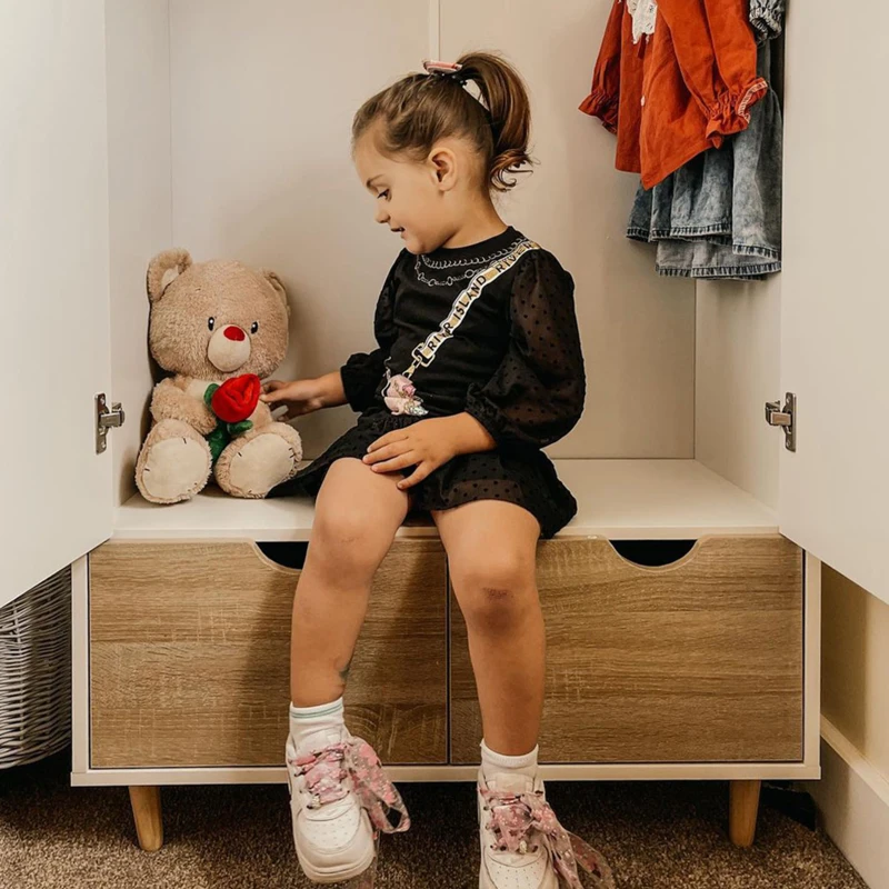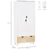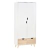 ELEGANT: Fresh white in colour, with wood-effect bottom drawers for a complementary look. Simple and beautiful, it will stand tall and proud in any bedroom. || SPACIOUS: Features the main compartment with a clothes hanging rail and top shelf, on the bottom there are two slide-out drawers for keeping folding clothes, shoes and accessories. Cut-out handles on the doors for easy opening. || PARTICLE BOARD FRAME: Ensures a durable structure for reliable everyday use, with a smooth and protective melamine coating. Anti-toppling straps for safety around children and pets. || WOOD LEGS: Provides balance and elevates wardrobe for air flow. DIMENSIONS: 180H x 80W x 40Dcm. Clothes rail: 76Lcm. || MAXIMUM LOAD 60KG. ASSEMBLY REQUIRED.
