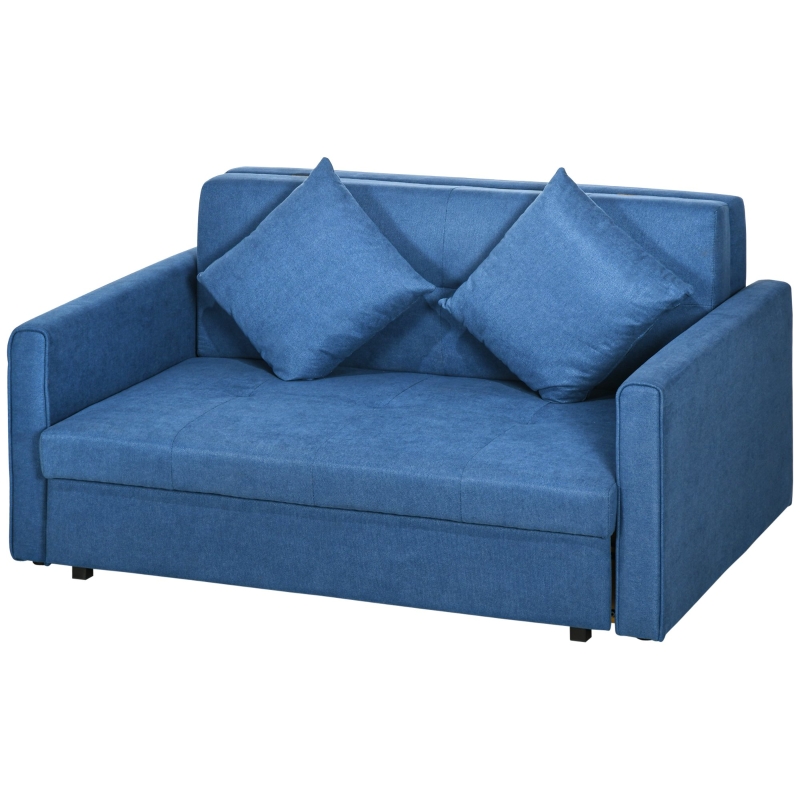 130 x 67.5cm storage compartment: Keep your space clean and clutter free – keep them discreetly stored in this sofa bed with storage. || Convertible design: From a settee into a place to rest, this two seater sofa bed is versatile. Use for overnight guests or small flats. || Comfortable: Double sofa bed for adults is filled with foam padding – great for sitting and sleeping. Two pillows including for extra comfort. Washable cotton-feel cover for freshness. || Robust: Wood, metal and MDF frame – this couch bed has a strong and supportive core. || Dimensions: Sofa: 78H x 152W x 101Dcm. Bed: 35H x 132W x 198Dcm. Maximum load 200kg. Assembly required. Made from flame retardant materials.