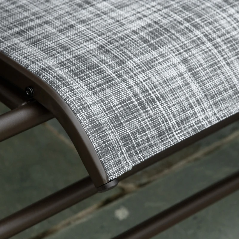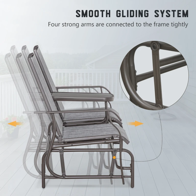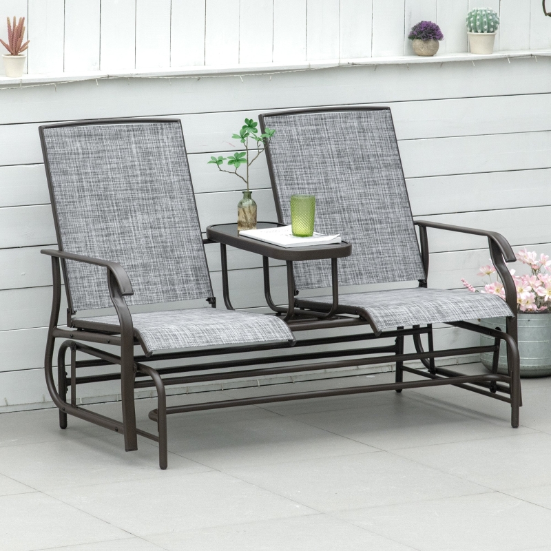 DOUBLE-SEAT GLIDER: Two single seats. attached together – with a middle table – room to relax with friends or family and enjoy food and drink together. Seats attached to the base, moving this garden rocking chair gently forwards and backwards to keep you relaxed. || MIDDLE GLASS-TOP TABLE: Convenient for keeping drinks and plates, magazines and more next to you. Glass safe, sleek and the glider chair is easy to clean. || METAL FRAME: Powder coated, structure of the garden rocker is strong and supportive. Fabric seats hold your body comfortably. High backs and armrests for support. || DIMENSIONS: 101.5H x 147W x 78Dcm. || MAXIMUM LOAD 120KG PER SEAT. ASSEMBLY REQUIRED.
