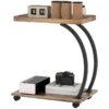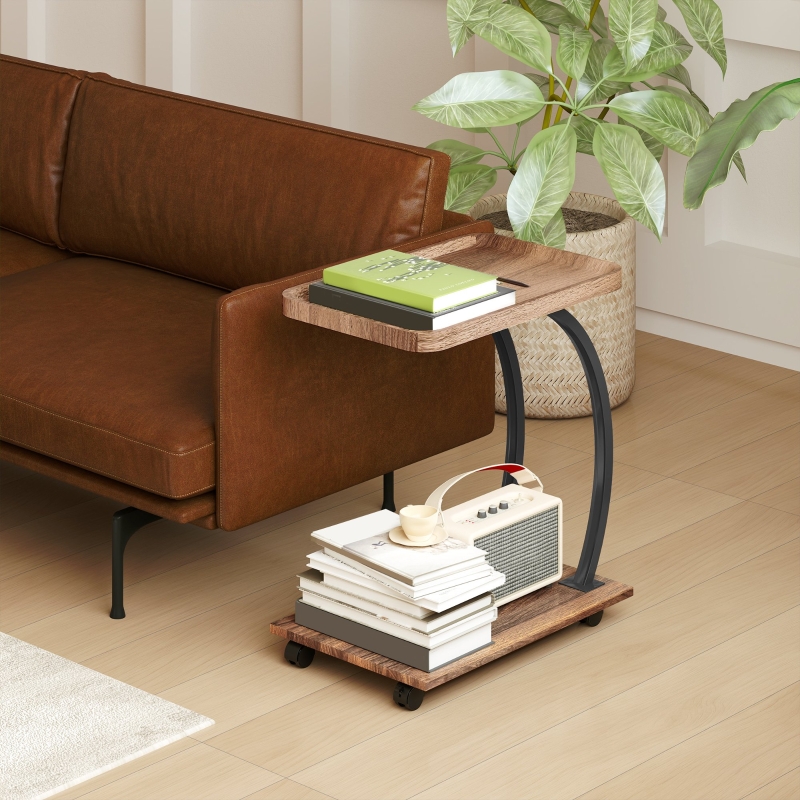 C-shaped convenience: This small side table features a C-shaped design that easily slides under your sofa, bed, or chair, enhancing your living space with effortless access and usability || Two-tier storage with tray top: This two-tier small table offers plenty of space for your books, beverages and snacks, while its tray top with curved edges keep items secure and prevent spills || Mobility made easy: Fitted with four wheels, this sofa table is simple to manoeuvre around your living area; two wheels have brakes for stable and safe positioning when needed || Strong build quality: Constructed from robust MDF and steel, this small bedside table combines longevity and style, making it a practical addition to any room || Dimensions: 52L x 34W x 60H cm. Maximum Load 18 kg. Assembly required