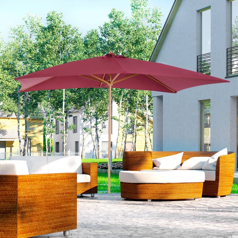 Canopy with vent: The polyester fabrics with top vents, which allows wind flow quickly and more durable in windy || Sturdy wood pole: 6 Bamboo umbrella ribs frame for extra stability to the canopy, keeps the market parasol stable and secure || Easy to use: With convenient design, comes with a rope pulley mechanism for easy opening and closing. The spiral connector method for easy assembly and the outdoor parasol can be fixed in four positions by latch || Stylish appearance: Our wooden parasol with durable material, combined traditional workmanship with modern aesthetics, unique and utility. It is also an amazing addition for your rattan furniture or outdoor dinner table || Overall dimension: 200L x 295W x 255Hcm. Please note, this listing is for the patio parasol only, the parasol base is not included.