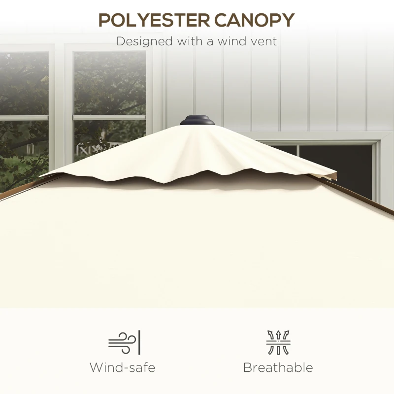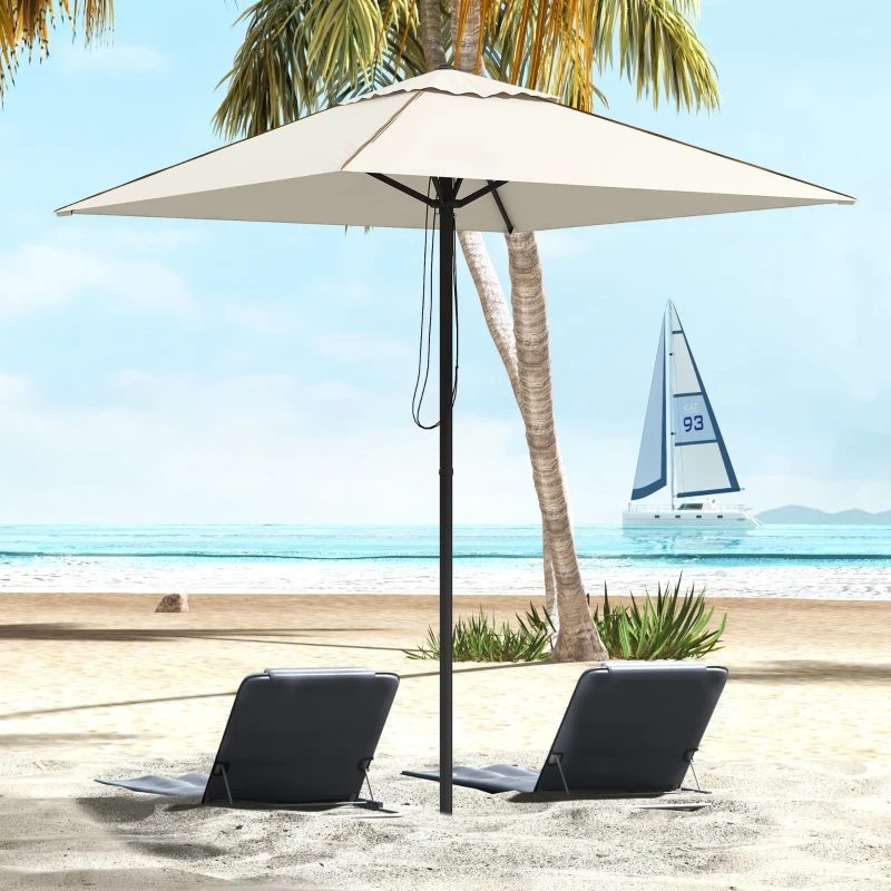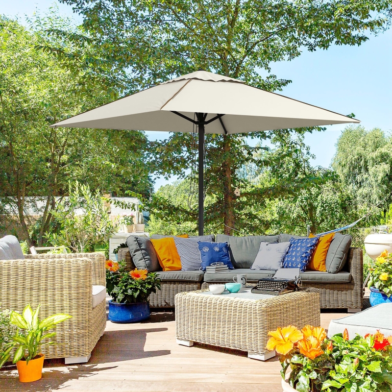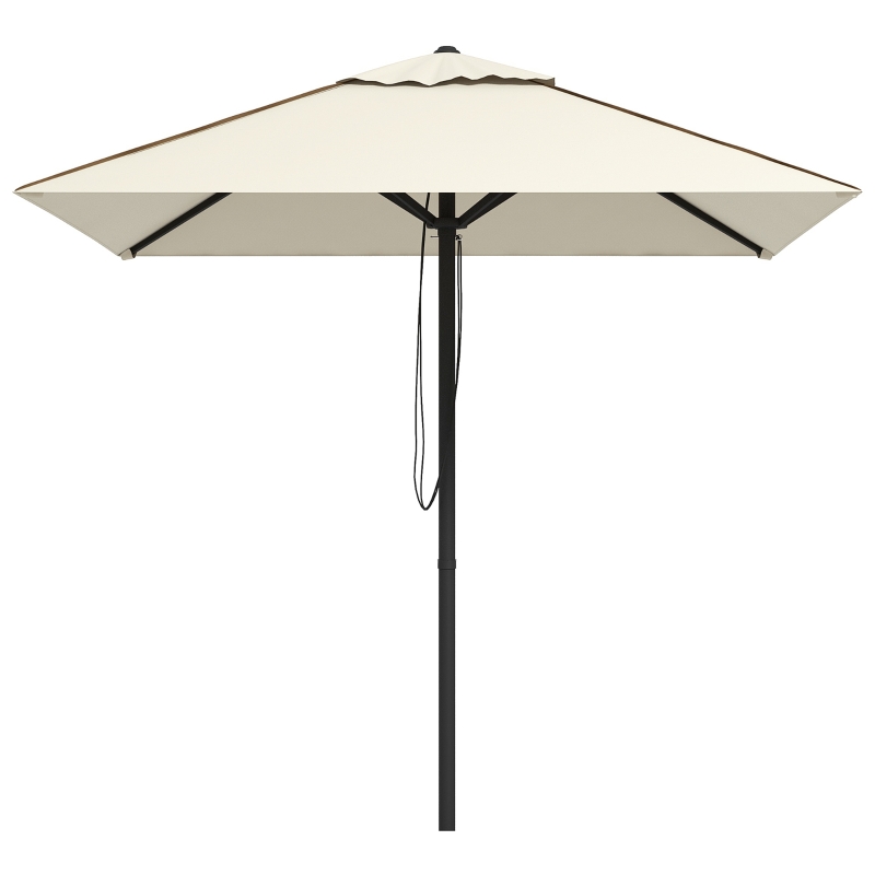 180gsm fabric canopy, with vent: Garden umbrella ensures safe shade for you. Top vent to help keep controlled in wind. || Steel frame: Powder coated for extra strength, sun parasol has a steady core. || Pull-rope operation: Easy to open and close parasol umbrella. || Easy setup: Connect the two pole sections together. Outdoor parasol can be carried and moved around easily. || Dimensions: 2.57H x 2.15L x 2.15Wm. Suitable Best base: 84D-046BK. Do not use parasol in strong weather conditions.