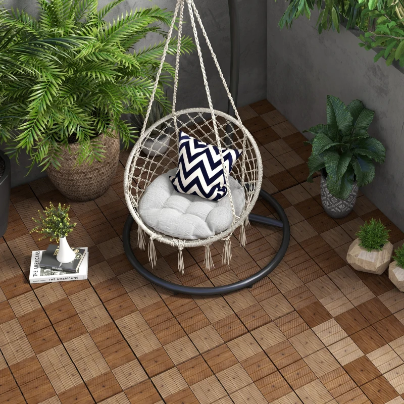 27-piece set: Three package of interlocking decking tiles cover 2.43m² area. Use one pack alone, or build with more to expand the space. || Wooden slatted tops: Beautiful and tough outdoor flooring. Resistant to rot, warping and splintering for reliability. Grooves to increase friction, in turn reducing skids and slips. || Interlocking design: Click each decking tile into the other to stay together. Super easy to set up – saving you plenty of time for other tasks. || Versatile: Garden floor tiles can be used on many different flat grounds – terraces, walkways and workout areas. || Dimensions: Single piece: 2.5H x 30L x 30Wcm. Not suitable for pets walking on.