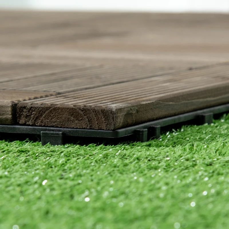 27-piece set: Covers a 2.5㎡ area, great for kitting out an area in your home and outdoor flooring area. Brings a new lease of life to the space. || Wooden decking boards: Strong and beautiful patio flooring, with PVC bottoms, which are slip resistant. Decking tiles are also resistant to swelling, decay and fading. || Interlocking decking tiles: A hassle-free way to set up and take down, these garden tiles do not require any tools to fit into place. || Versatile: Garden floor tiles which can be used on different flat ground, such as terraces, walkways, swimming pools and sauna rooms – wherever you see possible. || Dimensions: Single piece: 2.5H x 30L x 30Wcm. Tiles wear out easily from pet claws.