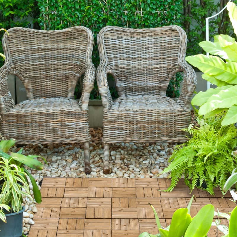 27-piece set: Covers a 2.5㎡ area, great for kitting out an area in your home and outdoor flooring area. Brings a new lease of life to the space. || Wooden decking boards: Strong and beautiful patio flooring, with PVC bottoms, which are slip resistant. Decking tiles are also resistant to swelling, decay and fading. || Interlocking decking tiles: A hassle-free way to set up and take down, these garden tiles do not require any tools to fit into place. || Versatile: Garden floor tiles which can be used on different flat ground, such as terraces, walkways, swimming pools and sauna rooms – wherever you see possible. || Dimensions: Single piece: 2.5H x 30L x 30Wcm. Tiles wear out easily from pet claws.