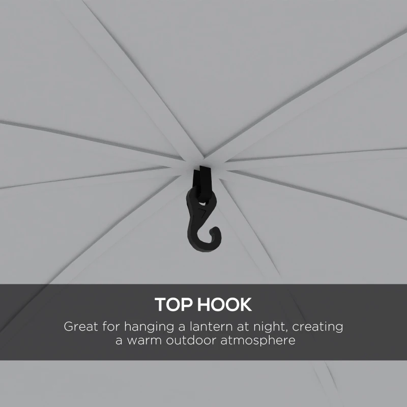 3.5X3.5M SIZE: Spacious, dome shaped: this garden dome gazebo provides lots of room to fit family and friends. || TOP INNER HOOK: Great for hanging a lantern in this garden shelter at night (note: be very cautious, do not hang open flames due to fire hazards). || OPEN FABRIC SHELL: PU coated polyester is durable and protects against light UV, rain and wind where possible. Sides keep air circulated and allows space for people to spill out if required. || ACCESSORIES INCLUDED: Guy ropes and ground pegs to keep this camping shelter steady. Bag to pack in and carry easily. || DIMENSIONS: 222H x 350L x 350Wcm. EASY TO ASSEMBLE.