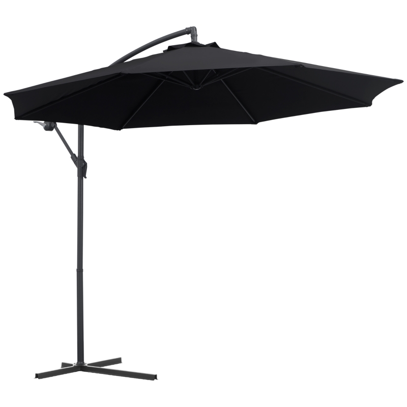 CANOPY WITH VENT: The 3m cantilever parasol canopy is made of UV resistant polyester fabrics with top vents, which allows wind flow quickly and more durable in windy || STRONG STEEL POLE: Keeps the overhanging parasol stable and secure. 8 umbrella ribs frame for extra stability to the canopy || EASY TO USE: Turn crank handle operation lifts the banana parasol up and pulls it down || LARGE SHADE AREA: Diameter 3m hanging garden umbrella parasol hangs over your dining set or garden set || DIMENSIONS: Φ300 x 250Hcm. Pole Diameter: 48mm. EASY ASSEMBLY REQUIRED. CROSS BASE INCLUDED. WEIGHTS REQUIRED.