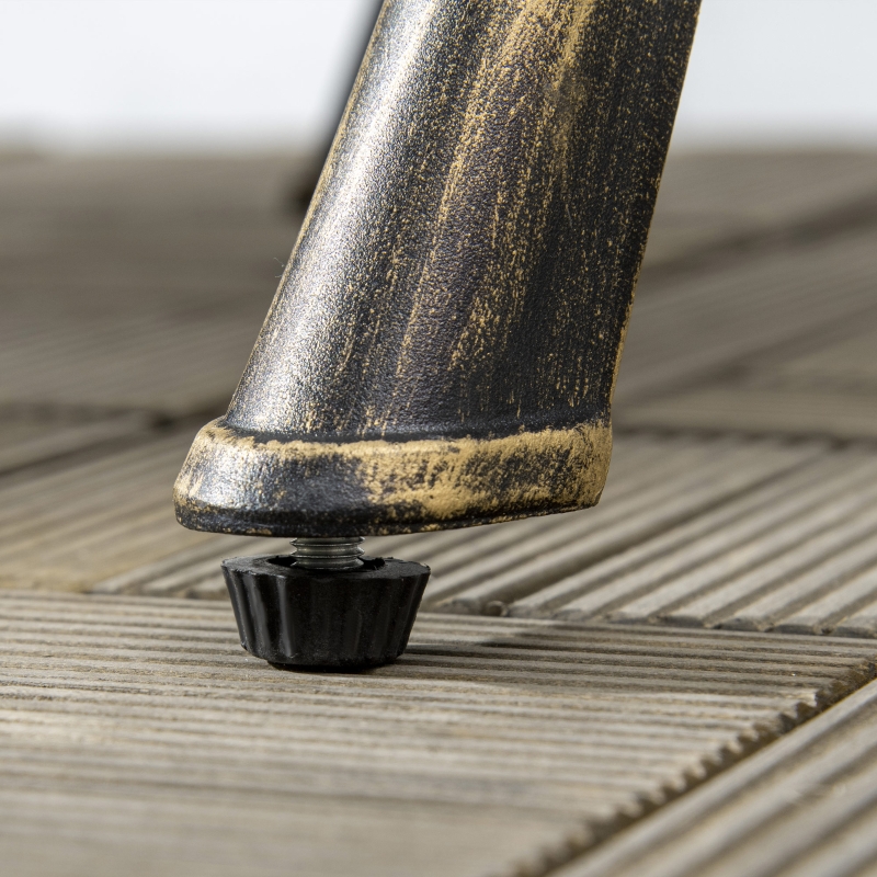 Three-piece bistro set: Formed of two armless chairs and matching round table. A great addition to your garden and outdoor areas – relax and unwind in style. || 48mm umbrella hole: In the middle of the table, a secure place to hold a parasol – keeping you protected from the sun’s glare. Parasol is not included. || Cast aluminium structure: All three pieces of this set is strong, supportive and resistant to rusting. Finished with a bronze coloured paint for a chic look. || Adjustable feet: Anti-slip pads keep the bistro table and chairs level and in place. || Dimensions: Chair: 88H x 39W x 52Dcm. Table: 65.5H x Φ60cm. Maximum load: Chair: 120kg. Table: 60kg. Assembly required.