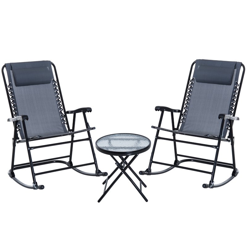 Best 3 Piece Outdoor Rocking Set with 2 Folding Chairs and 1 Tempered Glass Table, Patio Bistro Set for Garden, Deck, Grey