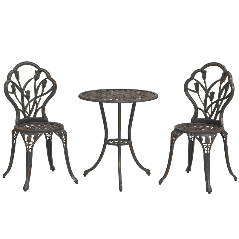 Three-Piece Patio Set: This stylish and functional set includes two chairs and a sleek round table, great for creating a cosy outdoor dining or relaxation space. || Φ44mm umbrella hole: This garden furniture holds a parasol with Φ38mm or Φ42mm pole in the middle. Keep safely shaded in the sun. || Aluminium structure: Powder coated for extra strength, these outdoor patio table and chairs are tough and prevent rusting. Additionally, the adjustable footpads ensure stability on uneven surfaces, offering enhanced comfort and support. || Retro design: Floral tulip on the outdoor table and chairs is elegant. A decorative addition to your space, adding a touch of elegance to any patio, balcony, or garden. || Dimensions: Table: 67H x Φ60cm. Chair: 89H x 42.5W x 47.5Dcm. Maximum load: Table: 30kg. Chair: 110kg. Assembly required.