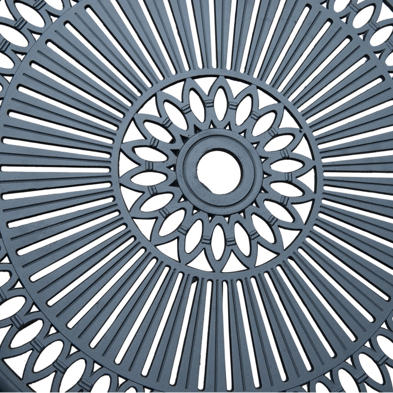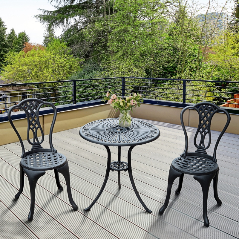 3-PIECE BISTRO SET: This vintage set comprises of 2 chairs and a round matching table to grace your patio, balcony, porch, and more. || HIGHLY DECORATIVE: The crossed lattice design on the back and the flower pattern on the table is vintage and elegant. || UMBRELLA HOLE INCLUDE: The 5cm parasol hole in the center of the table can fit a patio umbrella (not included) for convenient shade and cool relaxation. || PREMIUM MATERIAL: Crafted from solid cast aluminium with dipping finish for increased toughness, free maintenance, and years of use. || DIMENSION: Table Dimensions: 63L x 63W x 65H cm. Chair Dimensions: 48L x 44W x 85H cm.