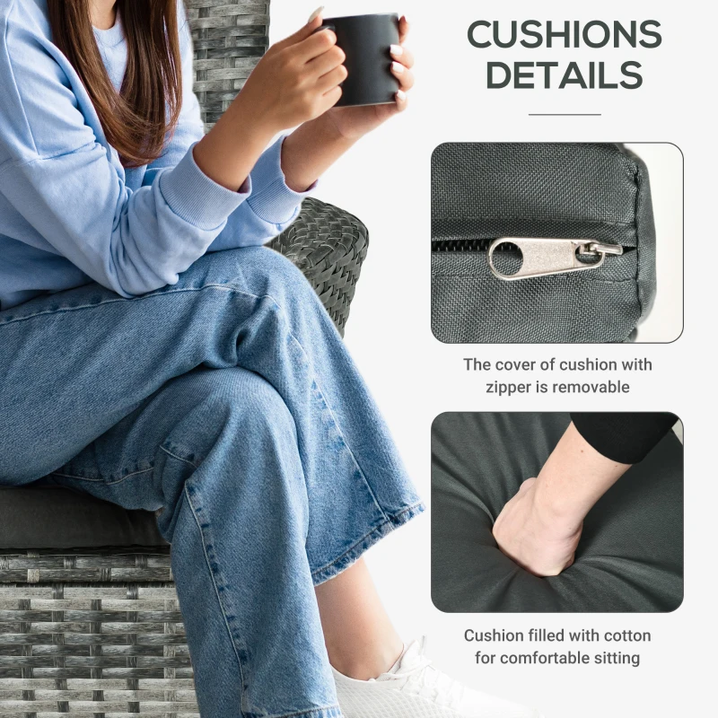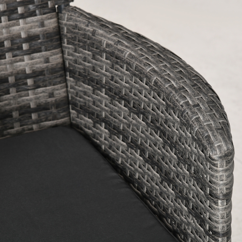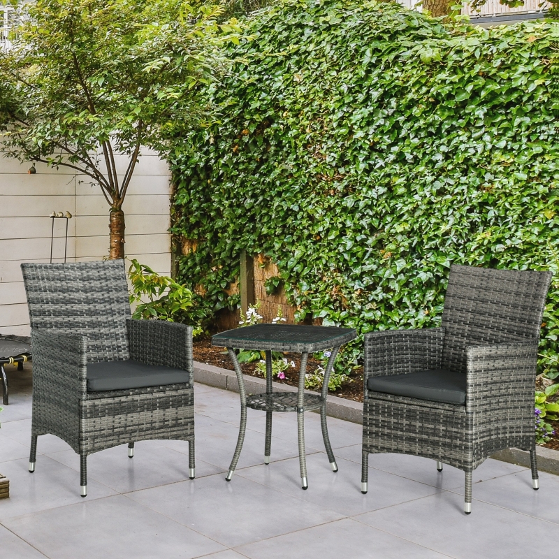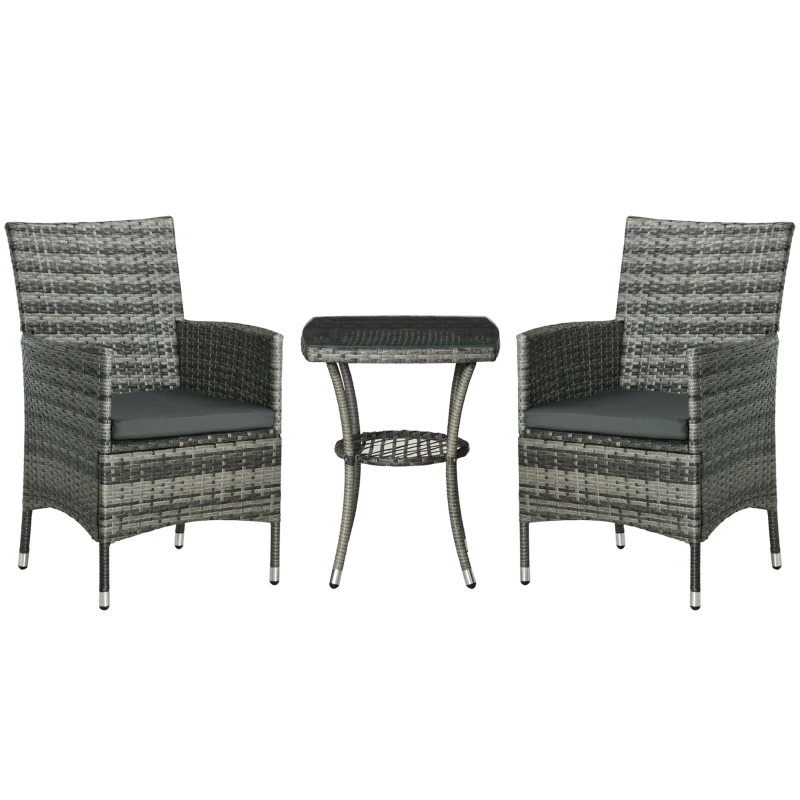 Affordable luxury: All-weather and long-lasting, this modern 3pc bistro set adds the great place to gather and relax. A great low-cost outdoor patio furniture for backyards, gardens, balconies, poolside, sunrooms and more! || Comfortable cushions: The garden bistro set for 2 with deep armchair with soft padded cushion to provide cosy sitting experience. Covers are removable and machine washable. || Tempered glass coffee table: The two tier table is finished with thin angled legs, it’s not only has a sleek, modern look but also provides a stable structure, the clear tempered glass top table is easy cleaning with a damp cloth. || Robust construction: Woven of low-maintenance material that replicates the look and feel of traditional wicker but is more resistant to sun, rain, heat and cold. Hidden underneath is a rust-resistant steel frame to provide lasting support. || Dimensions: Chair: 89.5H x 60W x 58.5Dcm. Table: 60H x 48W x 48Dcm. Maximum load: Chair: 160kg. Table: 50kg. ASSEMBLY REQUIRED.