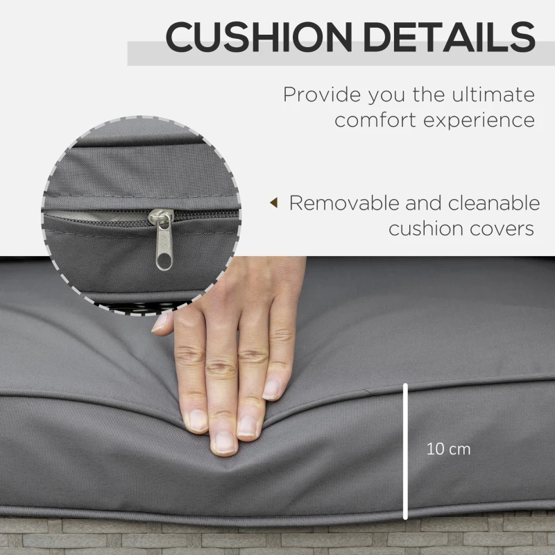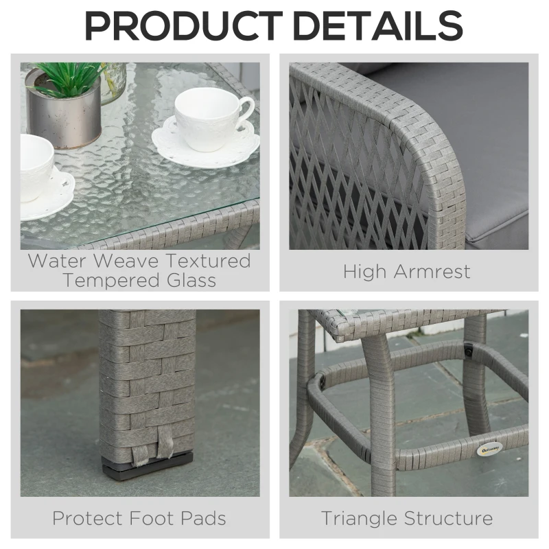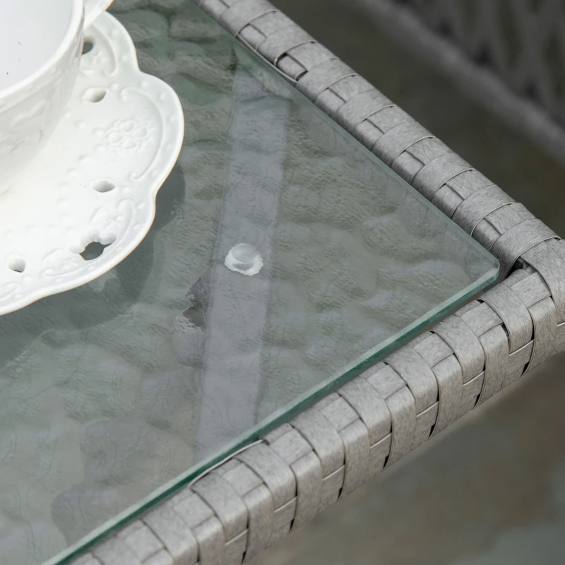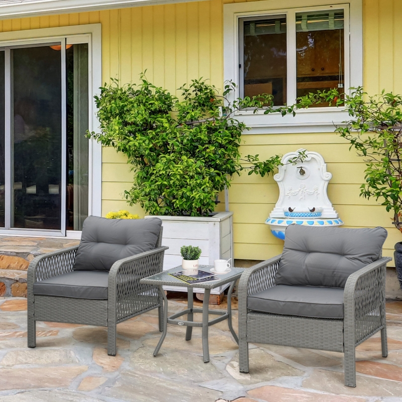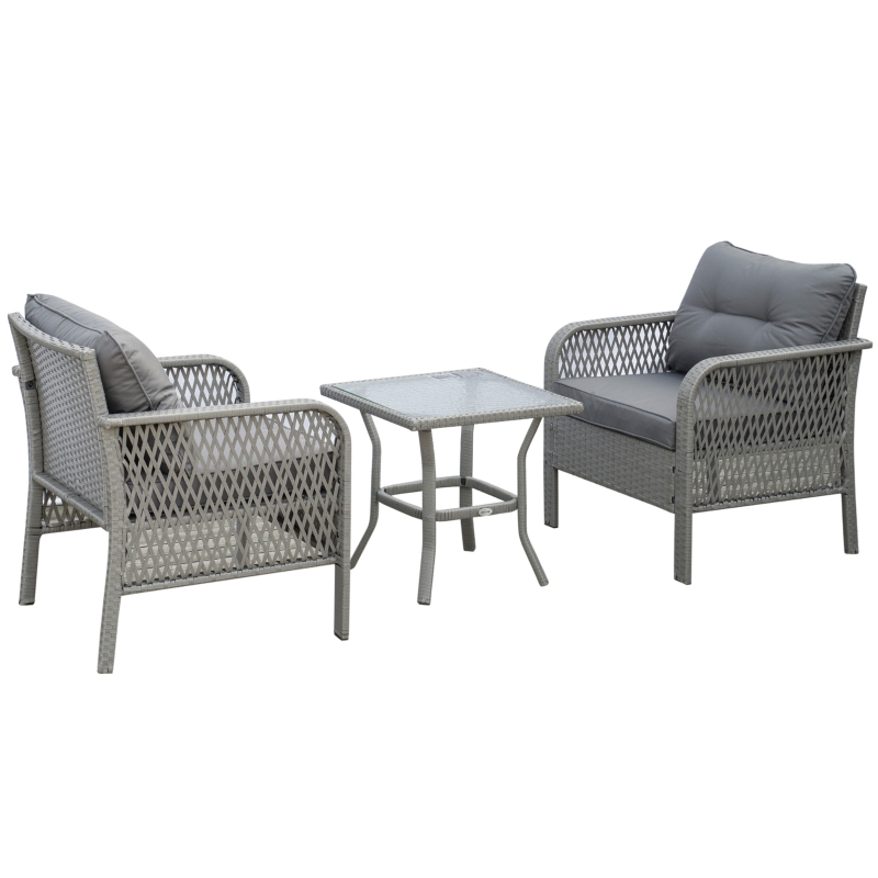 Three-piece set: Comes with two chairs with arms and a matching table. Both seats come with thick padded cushions for comfort. || Tempered glass tabletop: A safe and solid holding place for everything you need. A sleek touch to the over look. || Metal frame, wrapped in wicker: An on-trend garden design. Strong and supportive core, with protective plastic wrapped on top. || Padded cushions: Keep comfortable as you relax in this set. Seat cushion cover is removable and washable for hygiene. || Dimensions: Chair: 75H x 65W x 66D cm. Table: 50H x 50W x 50D cm. Assembly required.