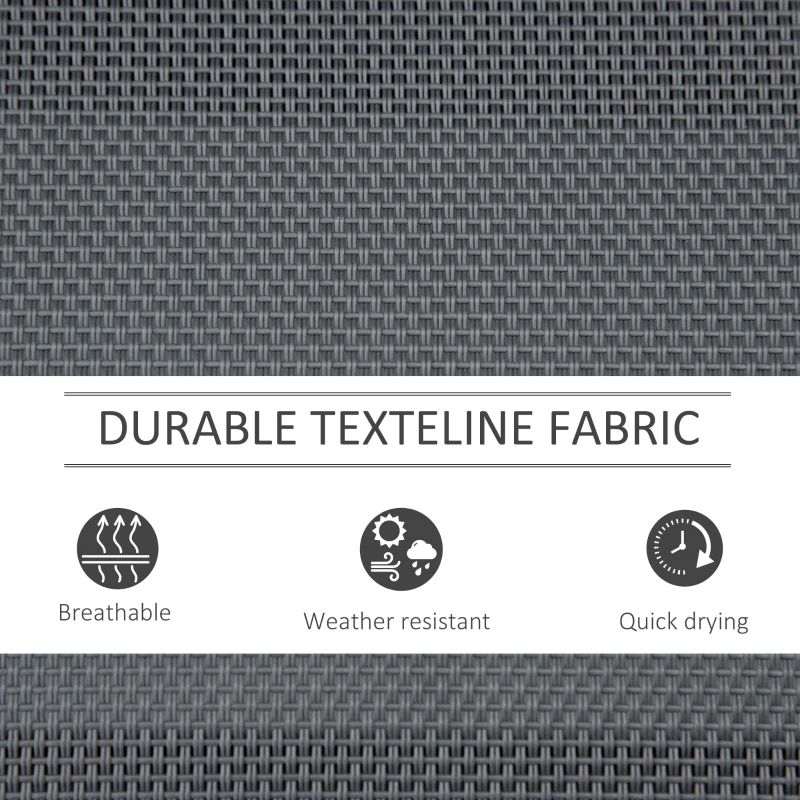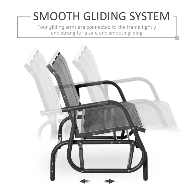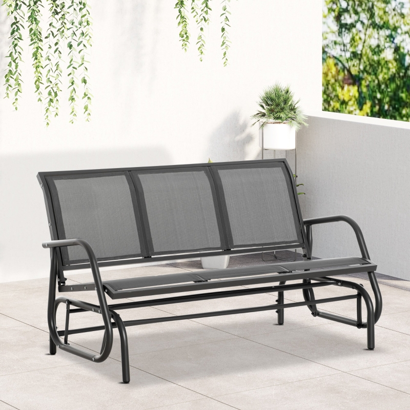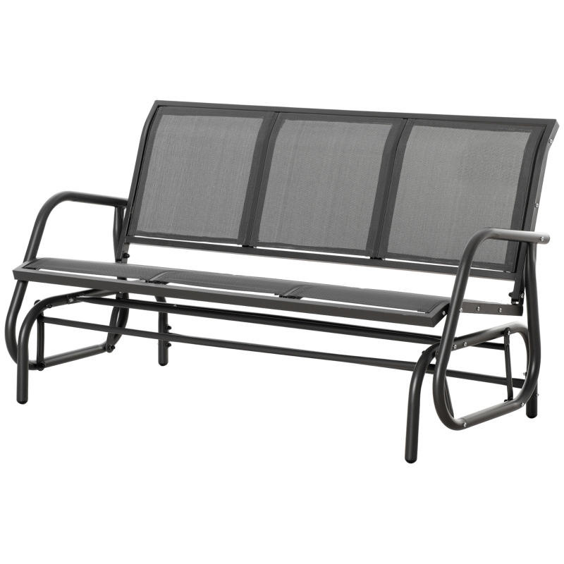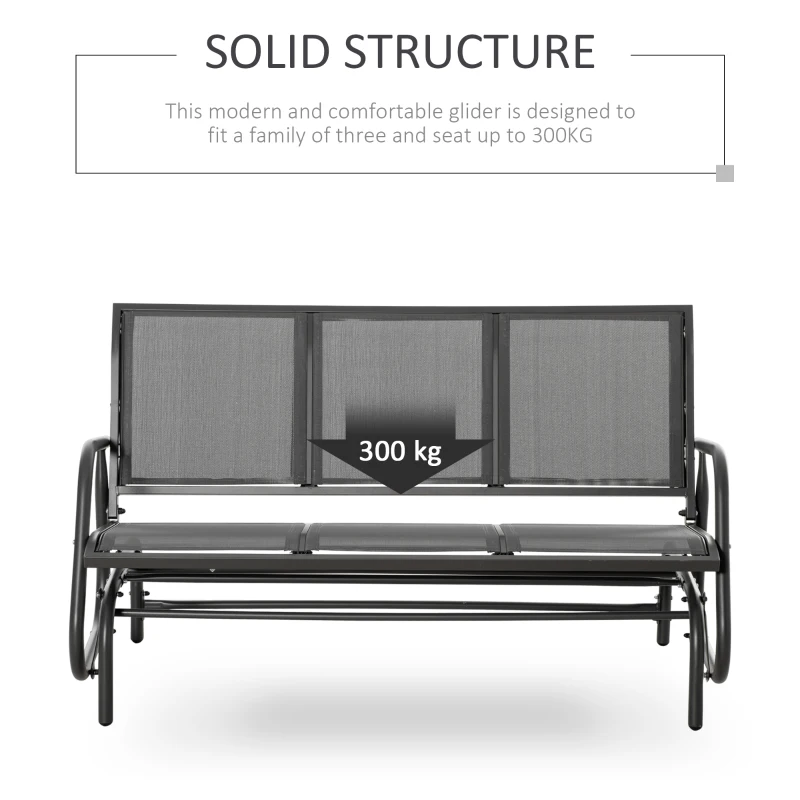Gliding design: Moves back and forth gently and smoothly, great for taking a break and relaxing. || Texteline fabric: Covers the seat and back, mesh finish is breathable. Water and UV resistant for use outdoors and dries quickly when it gets wet. || Metal frame: Powder coated for extra strength, it is a solid core which supports your body when being used. Mid-rise armrests and curved back for extra comfort. || Three-seater: Offers plenty of room to sit with others, great for enjoying a cosy time together. || Dimensions: 147L x 75W x 85H cm. Maximum load 300 kg. Assembly required.