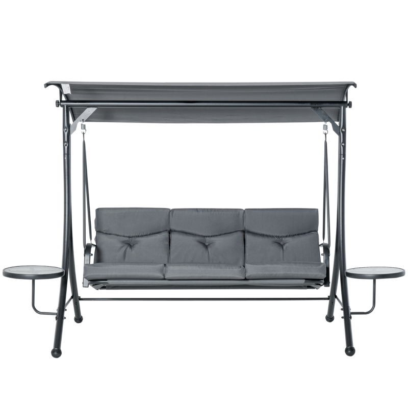 3-SEAT SWING: This patio swing with canopy comfortably hold 3 people, you can enjoy the sunshine and talk with your friends together. || ADJUSTABLE TOP: The freestanding outdoor swing’s canopy top is made from polyester, which can provide shade, so that you and your friends can stay comfortable even on the warmest days. The angle of the outdoor swing canopy can be adjusted according to your needs. || PRACTICAL & COMFORTABLE: There is a glass coffee table on the left and right of the outdoor swing bench, which is more convenient and comfortable. Porch swings outdoors well-padded cushion creates a more comfortable lounging experience. || STABLE & DURABLE: Made from a solid metal frame, this swing set for adults features sturdy construction with strong support for using longer time. || DIMENSION: Overall Dimension: 271L x 125W x 177Hcm, Canopy Cloth Size: 202L x 112Wcm. Coffee Table Size: Φ40cm. Weight Capacity: 300kg. Assembly required.