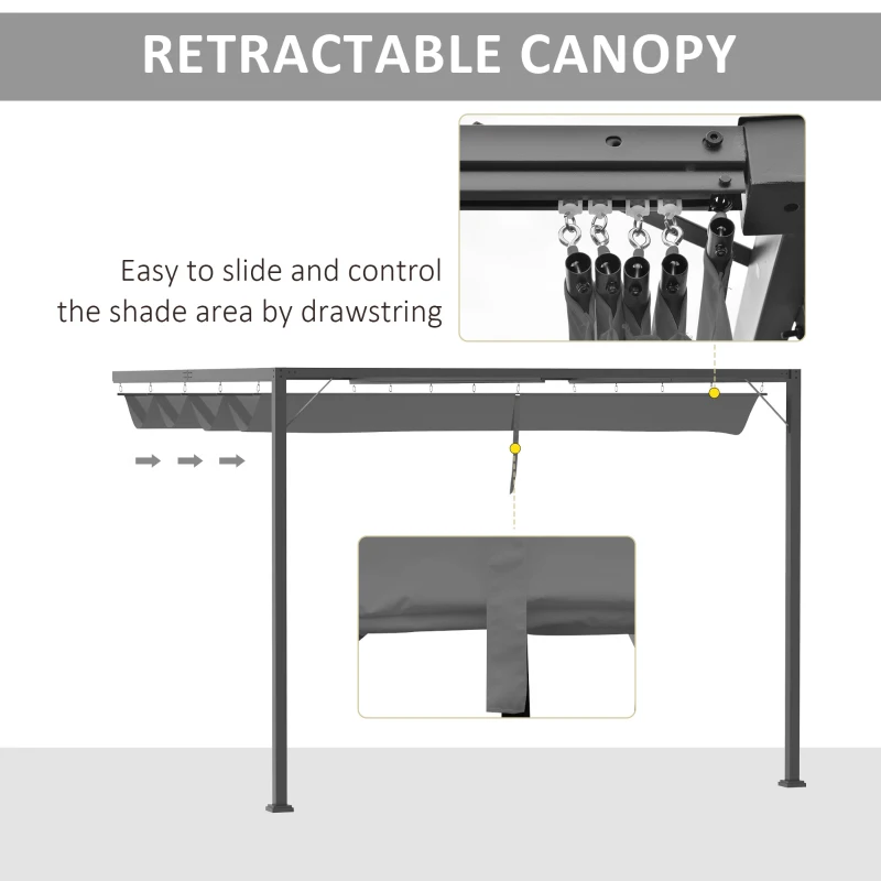 RETRACTABLE CANOPY: Adjust the protective top fabric to a position you want, keeping below fully or partially shaded. The pergola with retractable roof is suitable for use throughout the day. Moves with the drawstring. || METAL FRAME: A strong structure to stand steady for when the pergola kit being used outdoors. Triangle corners for extra stability. Stand by a wall to utilise properly. || UV-RESISTANT CANOPY: Coated canopy protects against direct sunlight and light rain. Great for use during all seasons. Easier for you to enjoy the weather outdoors with friends and family. And expansion screws and 4 ground nails to keep the metal pergola’s structure in shape and standing stable. || VERSATILE USE: This garden pergola provides spacious space for you to enjoy your leisure time with your family or friends. Ideal for mounting against the wall above a door or window for shade in the garden, which saves more space and installation effort. || DIMENSIONS: 226H x 294L x 294W cm. Column: 224H x 6L x 6Wcm.