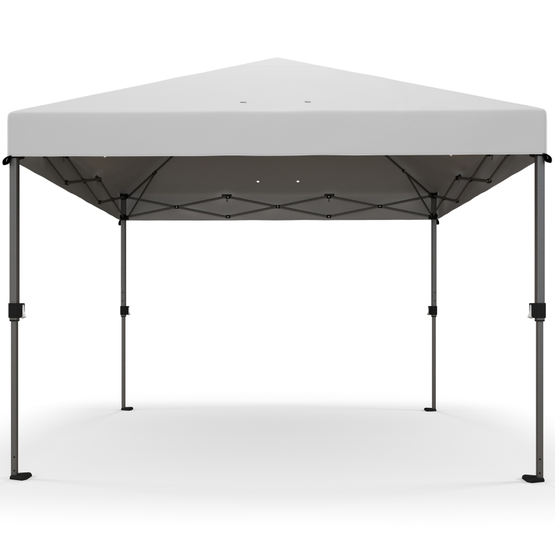 3 x 3(m) shade space: Pop-up gazebo offers room for outdoor gatherings and more. Room for approx. 6-9 people. || Powder coated steel frame: Garden gazebo has a strong core, fitted with oxford cloth canopy for 30+ UV protection. || Central button: Easy to set up and breakdown this garden tent, by a single person. || 3-level adjustable height: This camping gazebo features easy push-button height settings on each leg. Never worry about pinching your fingers with traditional-style pin press legs. || Wheeled bag: Wheel it where you want it; The wheeled bag fits your car’s trunk, letting you bring it camping, to cookouts, or barbeques. NEVER leave your party tent unattended; take it down before a major storm. Always use the included stakes, sand bags and guy ropes.