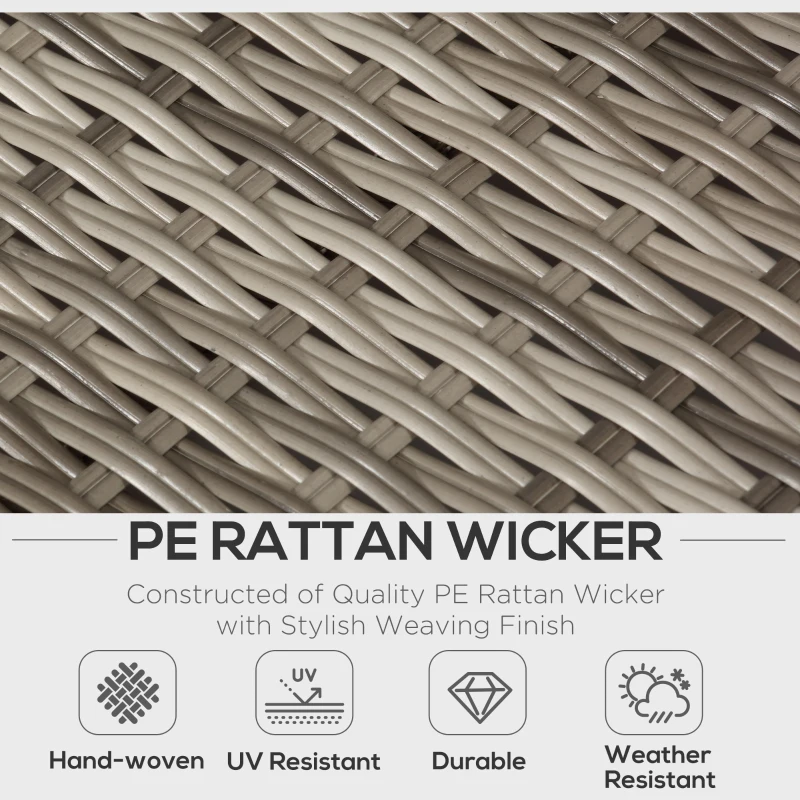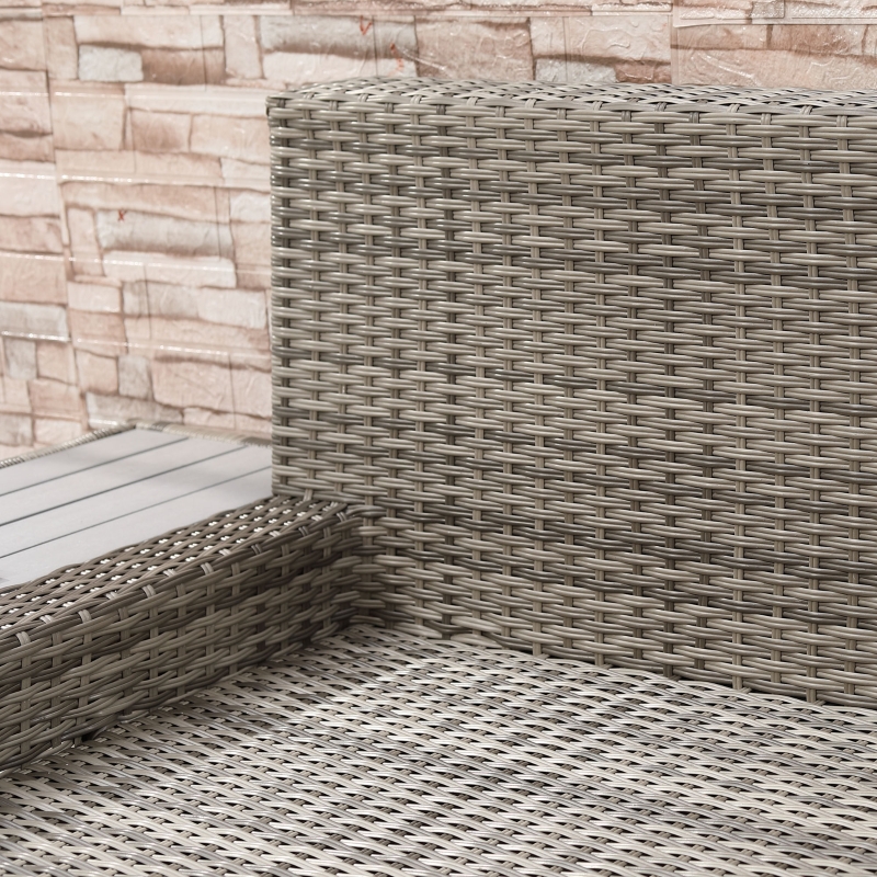 LUXURIOUS FOUR-PIECE SET: The rattan corner sofa includes two loveseats with attached end tables, a corner seat and a square table. The grey rattan sofa set can be arranged however you wish. || MADE FROM PE RATTAN: The metal frame of the garden corner sofa is easy to clean and look after and ensures durability for years to come. || STEEL FRAME: The steel frame of corner garden furniture keeps it stable and sturdy. WOOD GRAIN PLASTIC TOP ON TABLES: The rattan garden furniture sets are finished with a sprayed treatment, it can be looked after easily. || COMFORTABLE: The seats of the garden rattan furniture sets are with thick padded cushions provide hours of comfort and support. || DIMENSIONS: Table: 84W x 84D x 30Hcm. Corner seat: 84W x 84D x 73Hcm. Loveseat: 165W x 84D x 73Hcm. Loveseat seat: 125W x 68D x 30Hcm. MAXIMUM WEIGHT CAPACITY: Table: 80kg. Corner seat: 160kg. Loveseat: 320kg. ASSEMBLY REQUIRED.