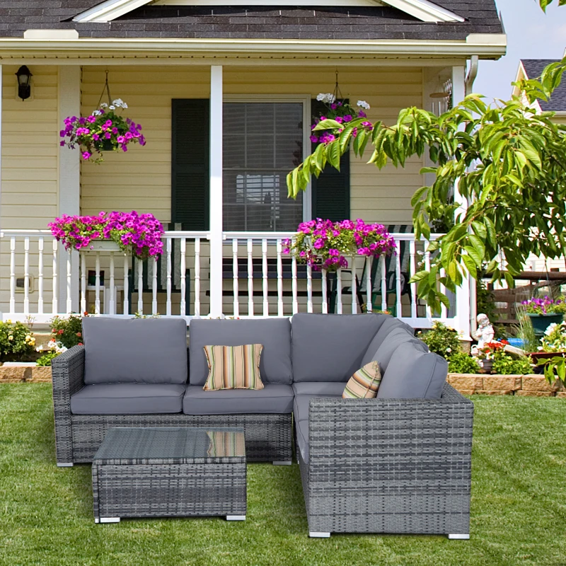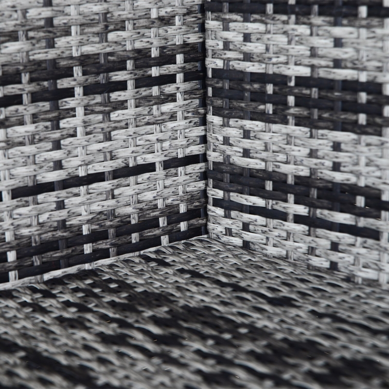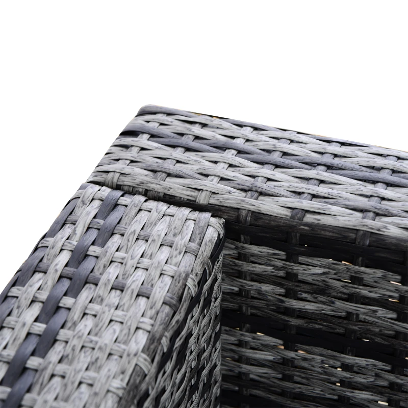 Four-piece garden sofa set: Comes with two loveseats, corner chair and table. || 11 cushions: Sink in comfortably into this rattan garden furniture set. Removable and washable covers. || Aluminium frame, wrapped in rattan: Each piece in this rattan furniture set has a strong core: plastic wicker over the top for extra protection and double the durability. || Glass-top coffee table: Keep things close as you relax on this outdoor corner sofa set. Sleek and solid top. || Dimensions: 76W x 76D x 68Hcm. Loveseat: 142W x 76D x 68Hcm. Table: 76L x 76W x 33H (cm).