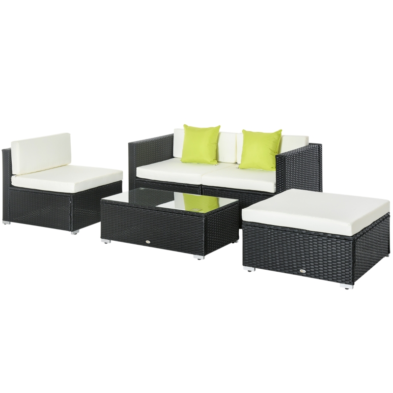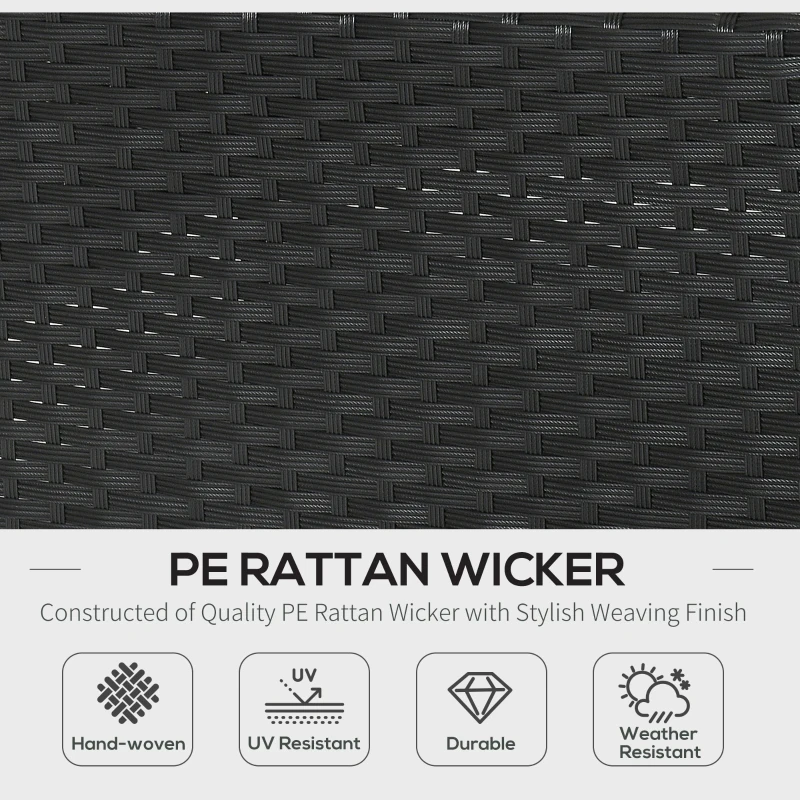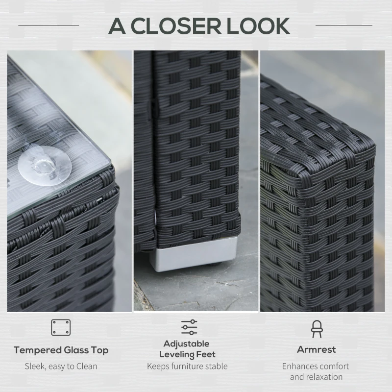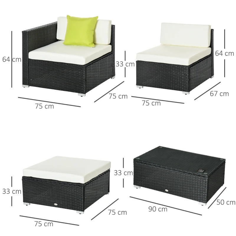 Modular design to be rearranged for optimal space efficiency || Built from a PE rattan wicker over rust-resistant galvanized Metal frame || Washable cushion cover made from water-resistant polyester cloth for easy cleaning || Extra-deep, low-seating modern seating and thick back-support cushions create the ultimate outdoor seating experience || Middle Sofa Size: 75L x 67W x 64H cm; 2 x Corner Sofa Size: 75L x 75W x 64H cm; Stool Sofa Size: 75L x 75W x 33H cm; Tea Table Size: 90L x 50W x 33H cm