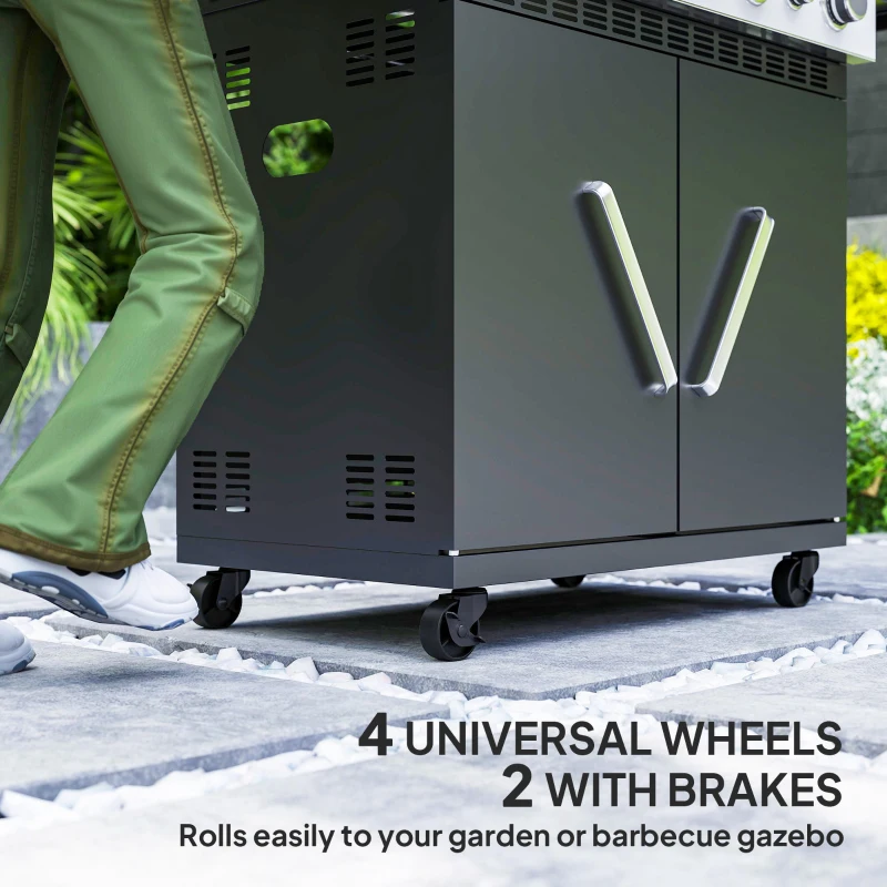 Spacious cooking area: Use your propane grill to cook up to 15 burger patties at once with a 2788 cm² grilling area, a warming rack and a side burner great for pan cooking. Easily cook for five to eleven people at a time || Clear view lid with thermometer: Close the lid of the gas grill to trap heat and infuse your food with a rich, smoky flavour. The lid lets you monitor your cooking without losing heat by opening it. The thermometer helps manage the temperature || Versatile storage solution: This large gas BBQ grill features a side table with S hooks for convenient preparation, and a built-in cabinet for holding your gas tank or storage || Independent ignition: Using independent burners with piezo ignition to grill at different heat levels for foods with different grilling needs. Great for everything from juicy steaks to tender vegetables || Convenient BBQ: This gas barbecue grill is easy to move anywhere you want with four universal wheels, two of which feature brakes for securing the grill in place. Additionally, the removable grease drip cup makes post-grilling clean-up a breeze