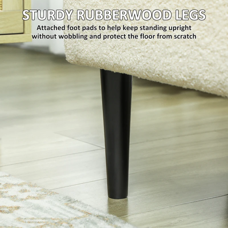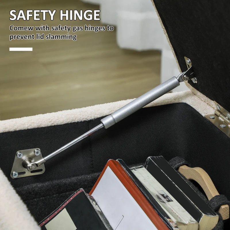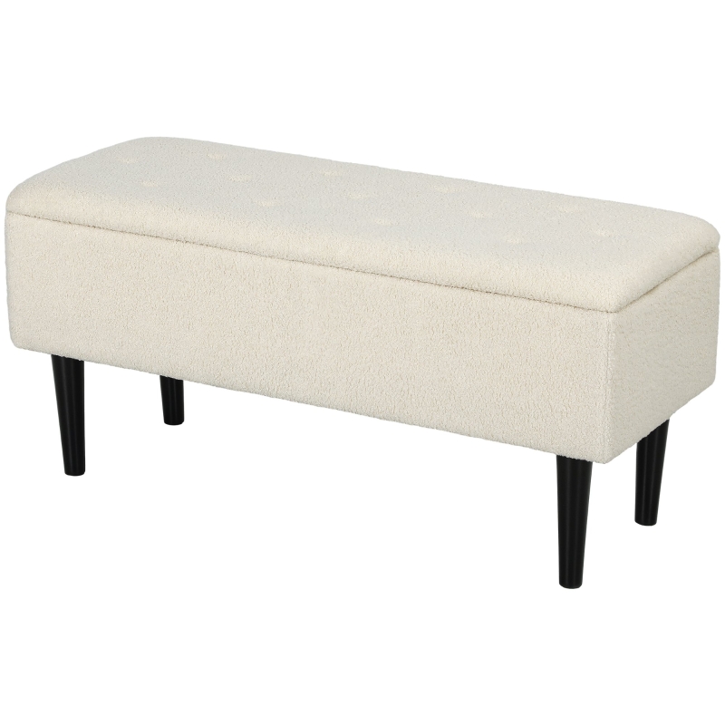 85 x 28cm inner storage: Ottoman has good amount of room for keeping small furnishings out of sight and the space discreetly tidy. 47 litre capacity. || Top padded seat: This storage bench is a spot to take some time out in comfort. || Wooden legs: A strong and supportive base for this ottoman storage box. || Teddy fleece upholstery: Super soft feel, in a neutral cream colour – ottoman storage chest mixes with other pieces easily. || Dimensions: 45H x 95L x 38Wcm. Storage: 20H x 85W x 28Dcm, Maximum load 120kg. Assembly required.