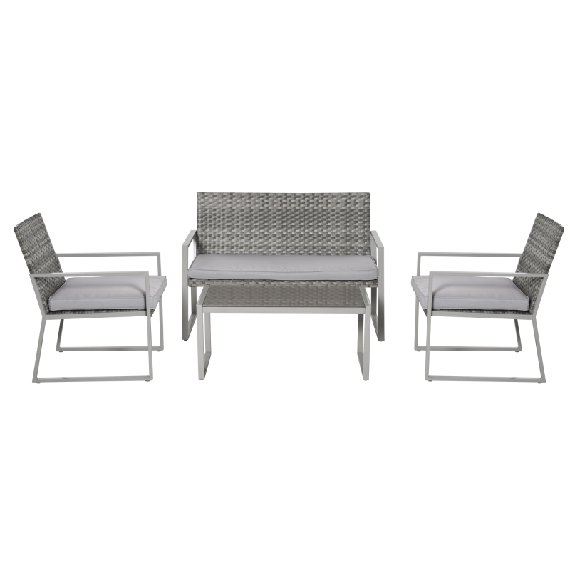 FOUR-PIECE SET: Stripped back yet still stylish, this rattan garden furniture sets include two chairs, a two-seater sofa and a matching coffee table. Compact yet comfortable, the garden sofa set is perfect for balconies, small gardens, patios €“ wherever you want to enjoy the fresh air. || STEEL FRAME: Matte black in colour, the frame of the grey rattan sofa set is strong, tough and resistant to rust and mild weather conditions. || PE RATTAN PANELS: Mixed-grey in colour for a unique and stylish look, the garden rattan furniture sets are with easy-clean resin coating for protection against UV and the elements. MATCHING TABLE: Fitted with a tempered glass top for a sophisticated spot to keep everything close to you. || FOOT PADS: The footpads of the small garden furniture keeps each piece stable and balanced, protecting the floor beneath. DIMENSIONS: Chair: 59.5W x 65D x 75Hcm. Sofa: 110W x 65D x 75Hcm. Table: 84W x 45D x 38Hcm. || MAXIMUM LOAD WEIGHT: Chair: 160kg. Sofa: 220kg. Table: 30kg. ASSMEBLY REQUIRED.