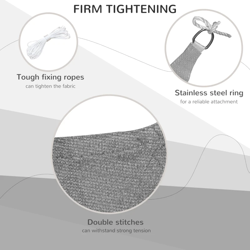 EASY OUTDOOR SHADE: Sail shade can be set up in all kinds of spaces. Keeps you protected under the sun all day long || SELECTED MATERIAL: Made from 185gsm high-density HDPE with coating, this sun shades for garden will keep you protected underneath from direct sunlight and damaging UV rays. Reduces heat exposure to keep you cool || STAINLESS STEEL RINGS: Fitted on each corner, with double reinforced seams – attaches to the chosen area without the material ripping. Slots easy onto poles too || DIMENSIONS: 5L x 4W m. Rope: 2.5 m. Measure your designated area before purchase. ASSEMBLY REQUIRED || Installation tips: Rope included, the cloth surface needs to be inclined, and this garden sail canopy can be installed on poles, trees, or walls; Measuring tips: Please measure the actual size before buying, and preserve space of 0.1-0.5 m between the D ring of the sunshade sail and the installation point. The product isn’t rainproof, water will penetrate in rainy days.