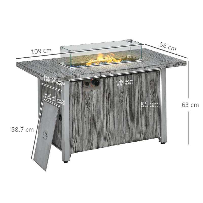 50,000 BTU burner: Stainless steel gas fire pit burner provides a powerfully clean, adjustable, smokeless burn. Pulse ignition system for easy operation (batteries included). || Also 109cm dining table: Gas fire pit table doubles up as a place for 4-6 people. || Gas-powered: Outdoor fire table is powered by a standard 5kg gas tank, with bottom holding area. || Waterproof cover included: Protects natural gas fire table. Keeps dry and protected. || Dimensions: 63H x 109L x 56Wcm. Maximum load: 30kg. Regulator and hose are included and pre assembled. Gas tank not included. Assembly required.