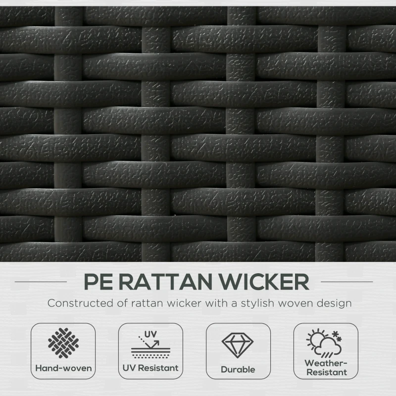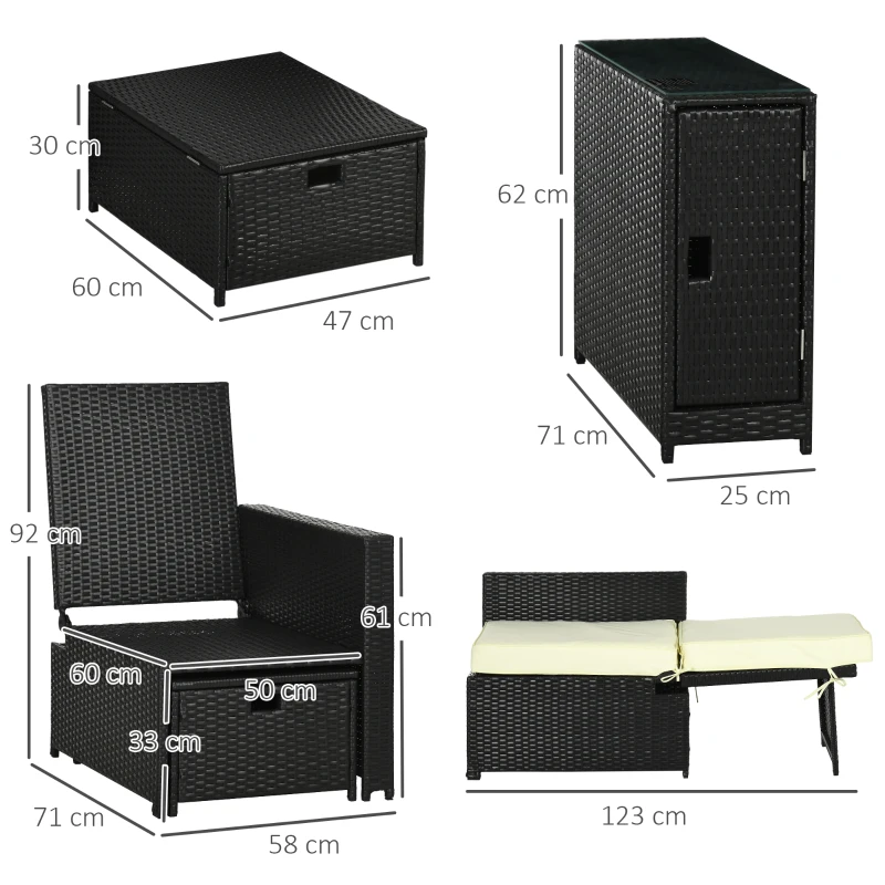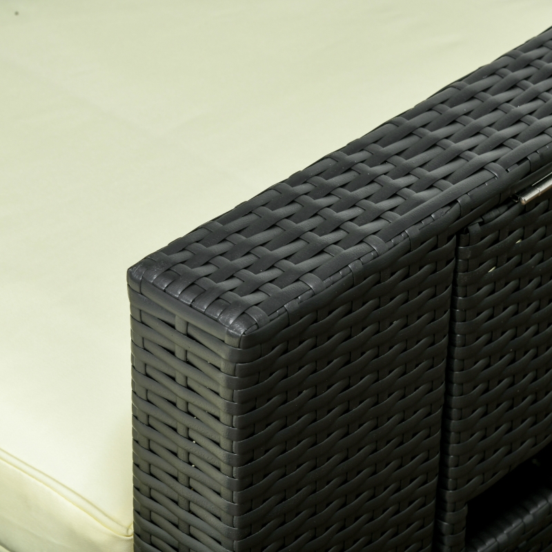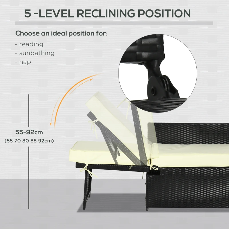 Five-piece set: This rattan sun lounger set comes with two lounger chairs, two footstools and a tempered glass-top side table. Relax with company whenever. Ideal for any kind of outdoor space. || Five-position rattan loungers: The back of each chair can be moved to various angles – time to relax the way you want. || Storage footstools: A handy and discreet way of keeping smaller items stored and out of sight. Great for any spare blankets and books you want within close reach. || Rattan design, with cushions. Both garden sun loungers and footstools are comfortable to use. Steel frames for a strong structure, wrapped in plastic wicker for a double the sturdiness. || Dimensions: Chair: 93H x 71L x 58Wcm. Stool: 30H x 47W x 60Dcm, Table: 62H x 71L x 25Wcm. Assembly required.