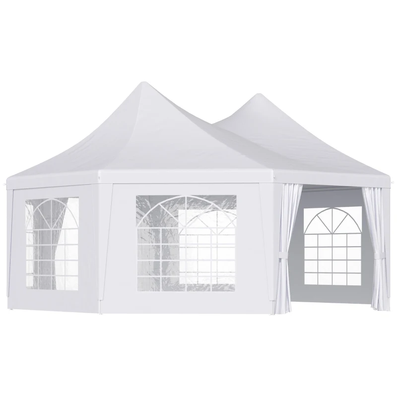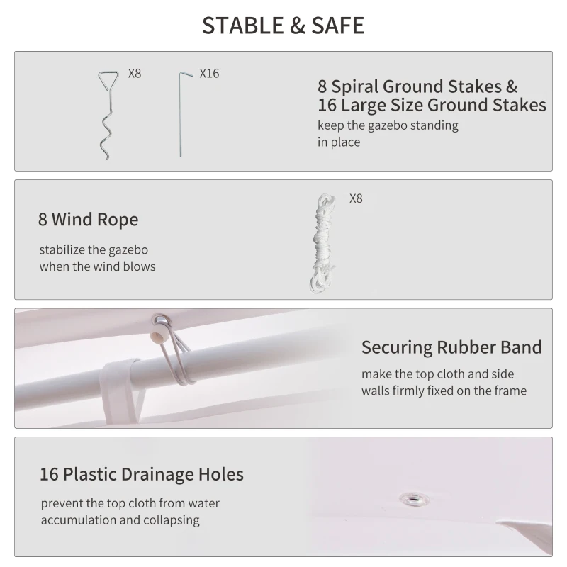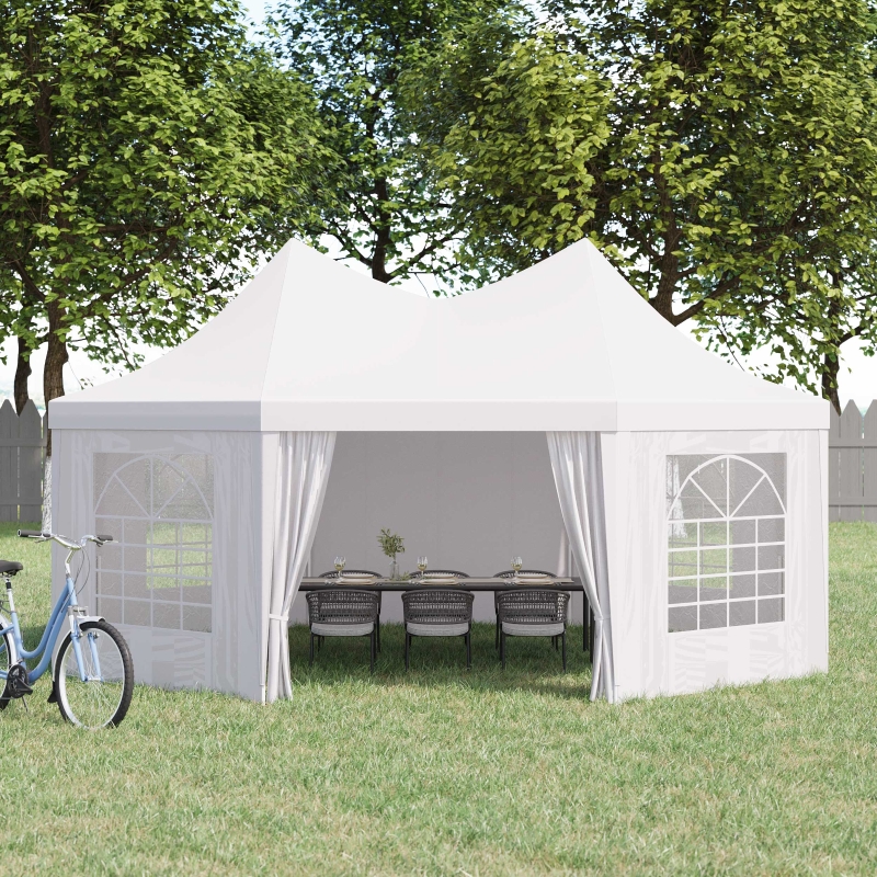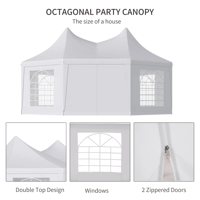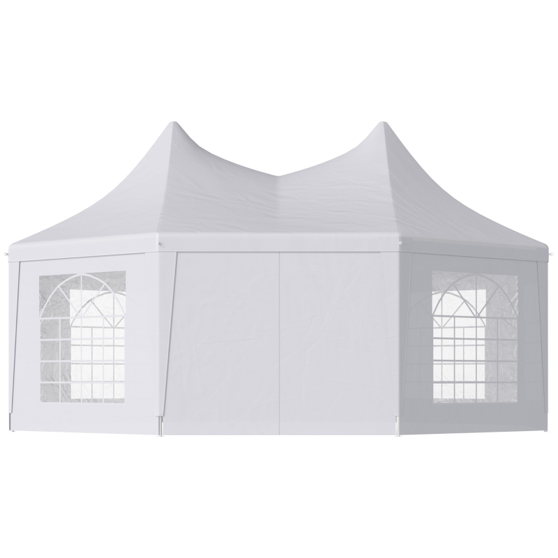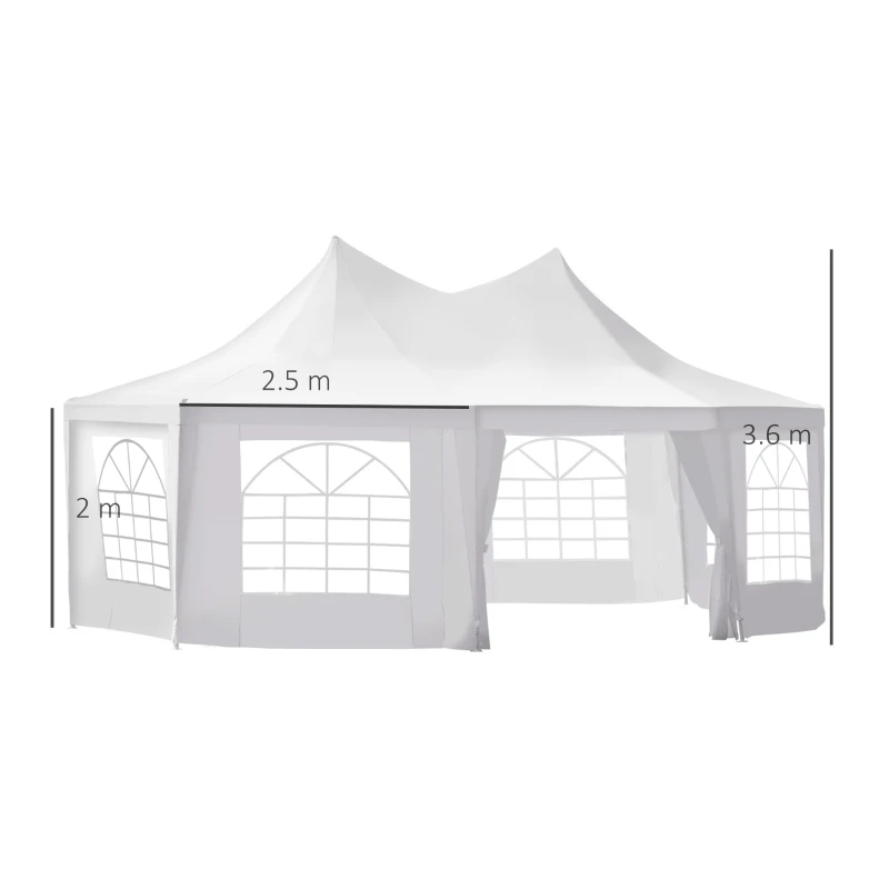 Large party canopy: The party tent measures roughly 30² and is ideal for gathering your closest friends and family. Wedding receptions, birthday parties, graduation celebrations, barbecues and much more. || Frame made of galvanised steel: This heavy duty gazebo requires a robust and solid structure. To pin to the ground, eight man ropes, eight spiral stakes and sixteen ground stakes are included. || Six windows and two doors: This enormous marquee gazebo has enough of light, so it doesn’t feel too dark when everyone is inside. There are two zipped doors for simple access. || Protective roof: When you’re inside this event shelter, the top of this heavy duty tent shields you from direct sunshine and light rain. || Overall dimensions: 6.8L x 5W x 3.6H m. Eaves height: 2.02H m. Do not leave the gazebo up at night or in strong weather, wind, or snow.
