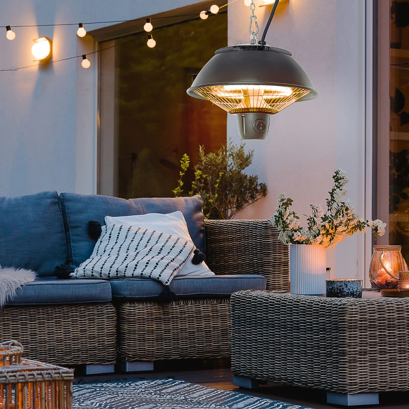 600W: Hanging patio heater with 600W power to distribute heat quickly and efficiently. || Aluminium Casing: Aluminium cover makes the patio heater more stable and safe. Mesh barrier to protect from direct heat contact. || Easy to Use: The outdoor heater is designed with a control switch, You can easily control the outdoor heater by it || Installation Method: The outdoor heaters for garden is easily attached to gazebo or outdoor ceiling with provided hook and chain. || Dimensions: Overall Size: Φ25.5 x 21.2H cm. Coverage Area: 10m²