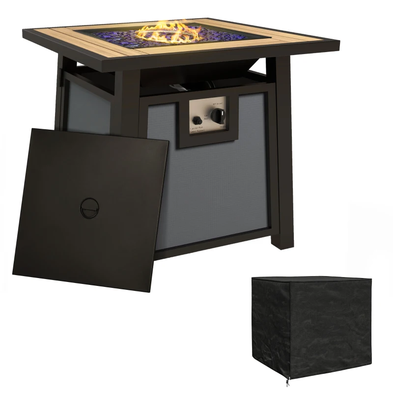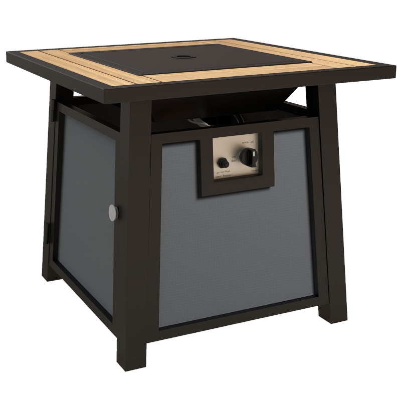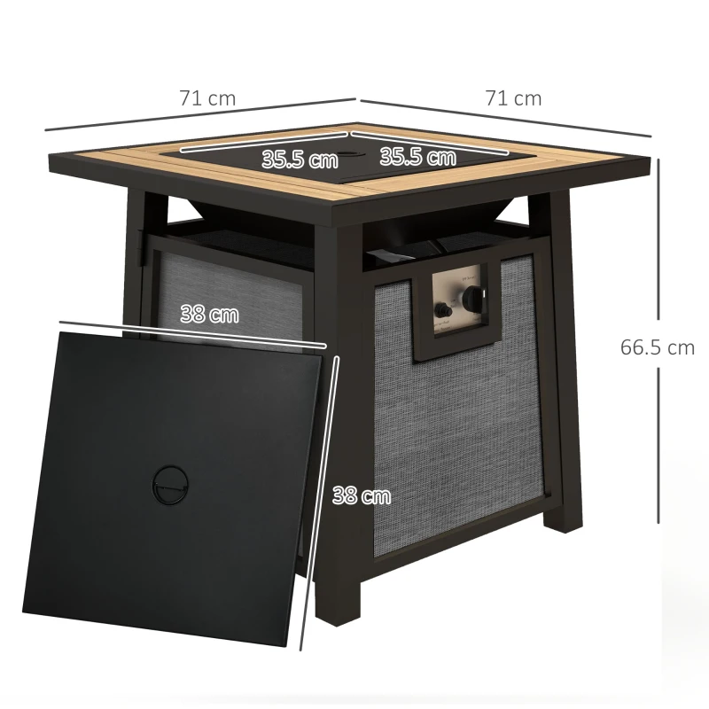 50,000 BTU burner: Stainless steel gas fire pit burner provides a powerfully clean, adjustable, smokeless burn. Pulse ignition system for easy operation (batteries required, not included). || Also 71cm dining table: Gas fire pit table doubles up as a place for 2-4 people. || Gas-powered: Outdoor fire table is powered by a standard 5kg gas tank, with bottom holding area and magnetic door. Safety shut off when fire goes out – helps prevent gas build up. || Waterproof cover included: Protects natural gas fire table. Keeps dry and protected. || Dimensions: 66.5H x 71L x 71Wcm. Maximum load 50kg. Regulator and hose are included and pre assembled. Gas tank not included. Assembly required.