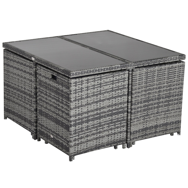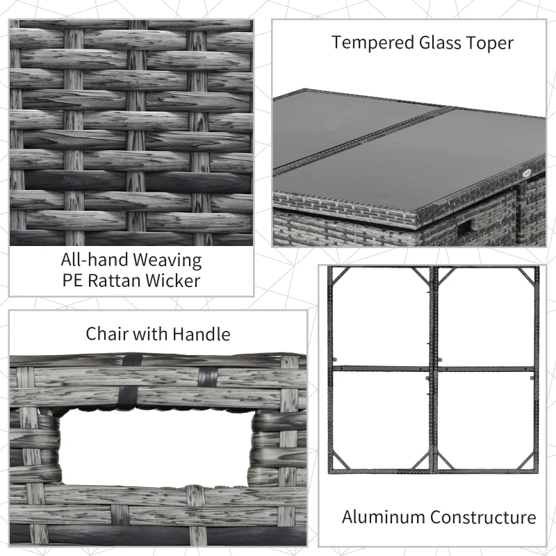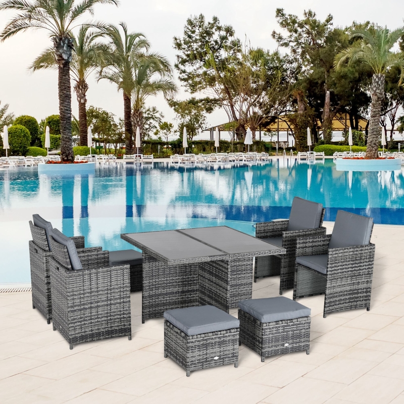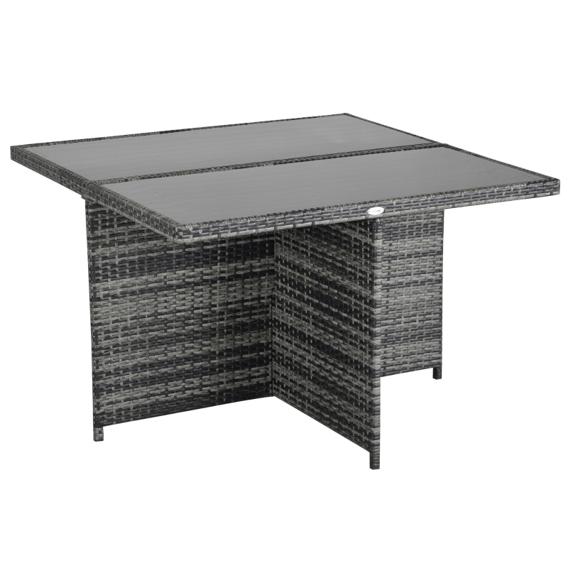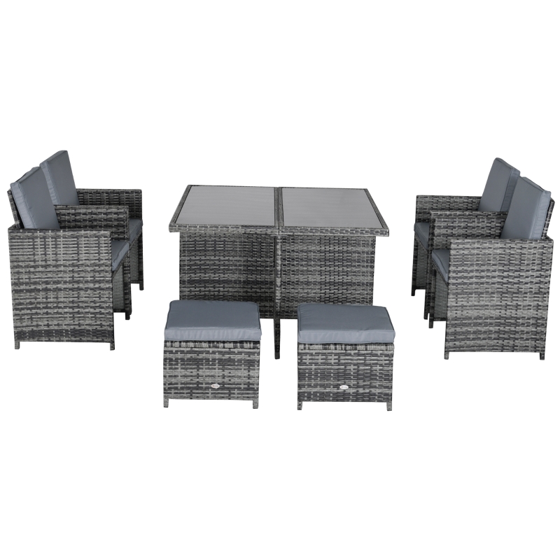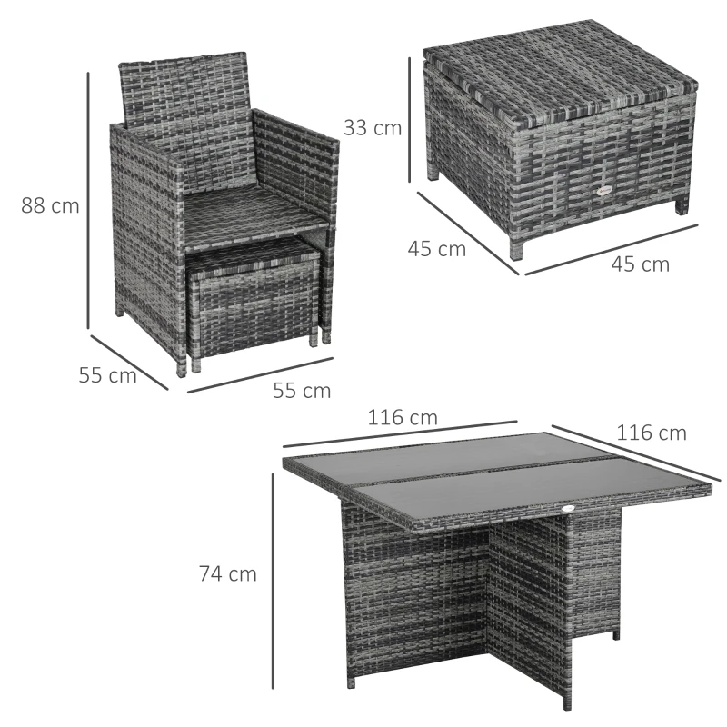 RATTAN DINING SET: 9 pieces rattan dining set includes 1 table, 4 chairs and 4 footrests || CONSTRUCTION: Constructed of strong aluminium frame and high-grade hand woven PE rattan || COMFORTABLE SEATING EXPERIENCE: Deep armchairs with soft padded cushions to provide cozy seating experience || STYLISH DESIGN: Modern and stylish lines and the black tempered glass table top add the beauty for your living area || DIMENSIONS: Table Size: 116L x 116W x 74H cm; 4 x Chair Size: 55W x 55D x 88H cm; 4 x Footrest Size: 45L x 45W x 33H cm