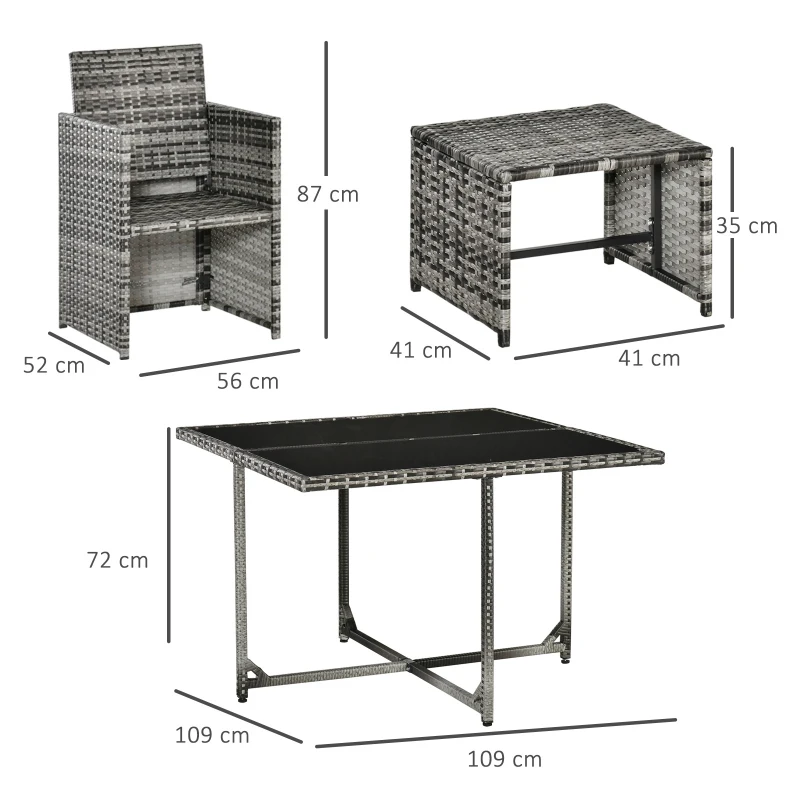 NINE-PIECE SET: Comes with one table, four chairs and four stools – room to bring everyone together outdoors. || COMFORTABLE: Chairs and stools come with cushions for you to sink into easily. Covers are removable and washable. || METAL WRAPPED IN RATTAN: Core structure is strong for full support. PE wicker is durable and tough, protects the structure underneath. Weather and UV resistant. || DIMENSIONS: Table: 72H x 109L x 109Wcm. Chair: 87H x 56L x 52Wcm. Stool: 35H x 41L x 41Wcm. || CHAIR MAXIMUM LOAD 160KG. ASSEMBLY REQUIRED.