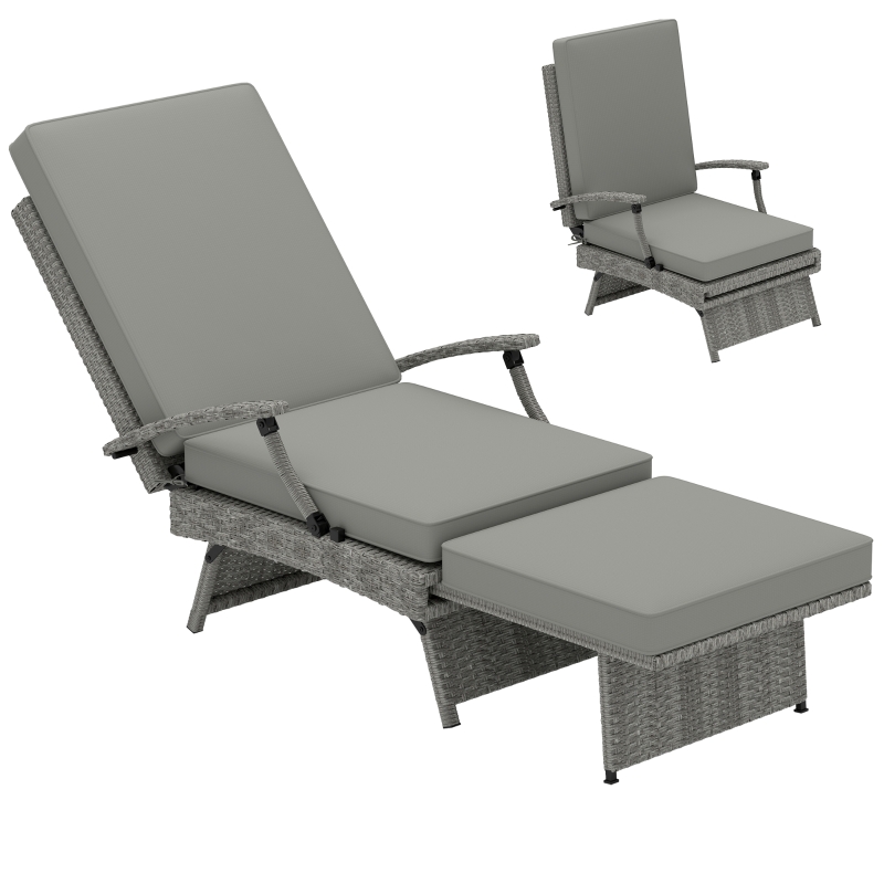80° reclining back: Set recliner garden chair to a position most comfortable for you. Enjoy relaxing in the sun your way. || Padded cushions: Sink into comfort as you relax on this rattan recliner chair. Removable and washable covers for hygiene. || Steel frame, wrapped in rattan: A strong core for this outdoor recliner chair. Plastic wicker outer is stylish and tough. || Foldable: Compact size when not using this reclining rattan chair. || Dimensions: Upright: 90H x 70W x 173D cm. Maximum reclined: 33H x 173L x 65W cm. Folded: 25H x 66W x 66D cm. Maximum load: 120 kg. Assembly required.