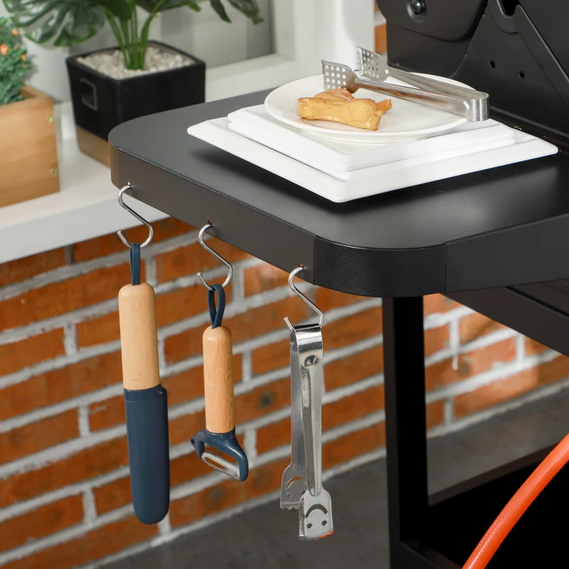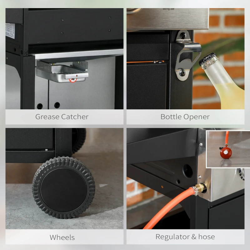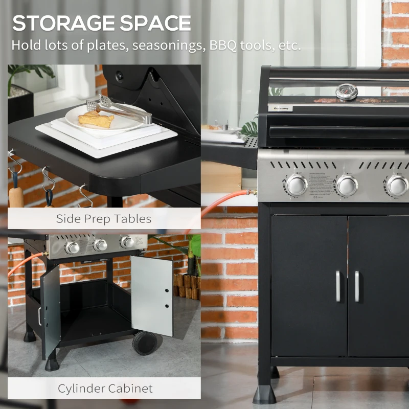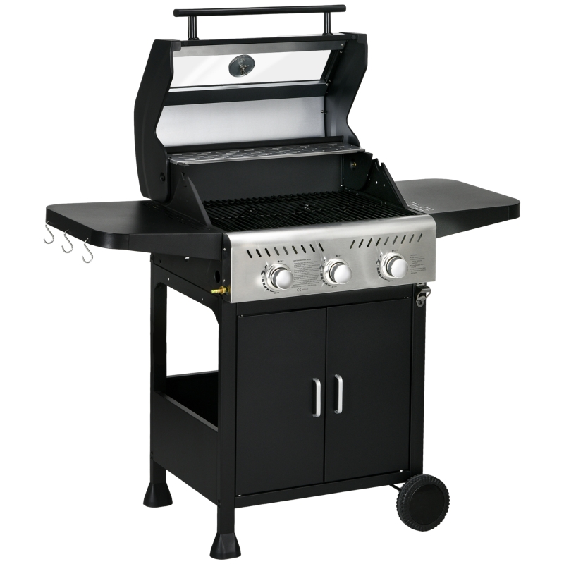 2408cm² grilling area: Three-burner gas bbq offers cooking room for 5-10 people. || See-through lid, with thermometer: Easily keep an eye on cooking. Also easy to see gas barbecue temperature. || Shelves and bottom cabinet: Keep cooking essentials within reach when using gas grill. || Grease catcher: Easy to empty and clean outdoor grill. || Dimensions: 110H x 123L x 53Wcm. Maximum load: Bottom shelf: 20kg. Grill grate: 10kg. Side shelf: 5kg. Assembly required. Regulator and hose are included and pre-installed.