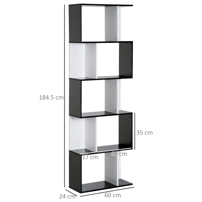 Modern bookcase: This 5-Tier S shape storage display unit adds modern and contemporary element to your living space, such as study room, bedroom, office and more || Sufficient storage & display space: 5-tier shelves with5 staggered dividers offer plenty of room for books, plants, photos, ornaments, small decors, and other home accents || Anti-tipping: This freestanding shelving unit features an anti-tipping design and can be fixed to the wall to prevent it from tipping over || Wide function: Multifunctional rack can be used as bookcase, display cabinet, shelving unit, storage unit and room divider || Storage organizer dimension: 60L x 24W x 184.5H cm. Assembly required.