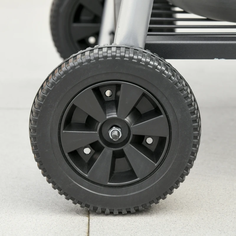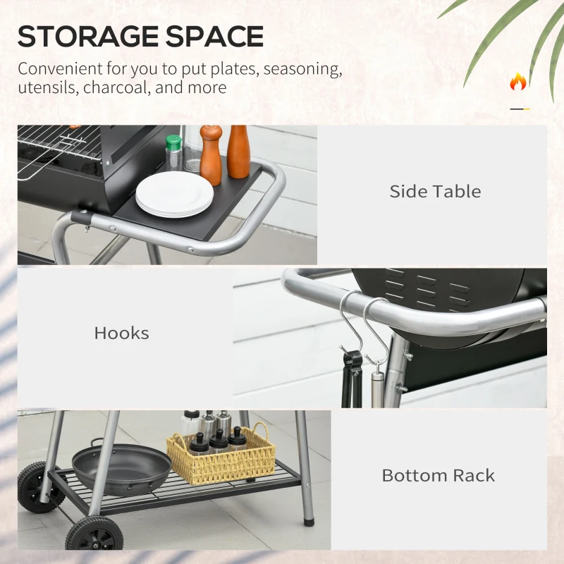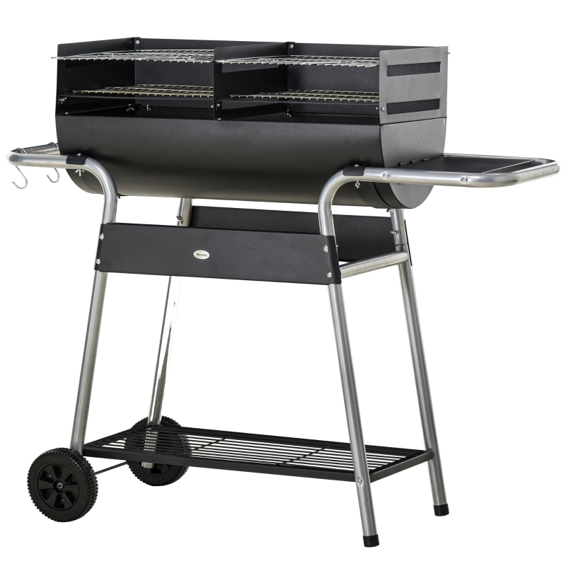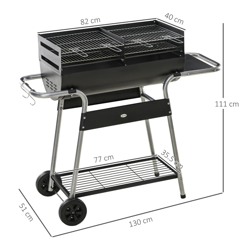 Double grill: Charcoal barbecue has plenty of cooking room. Cook food quicker, saves time. || 96/101/109cm adjustable grill height: Cook food at a distance from the heat best suited for the ingredient type. || Storage: Side table, bottom rack, hanging poles and three hooks for coal, plates, BBQ tools, towels and more. || Wheels and handle: Portable BBQ grill is easy to move around. Take it to different areas when needed. || Dimensions: 111H x 130W x 51Dcm. Single grilling area: 40L x 40Wcm. Assembly required.