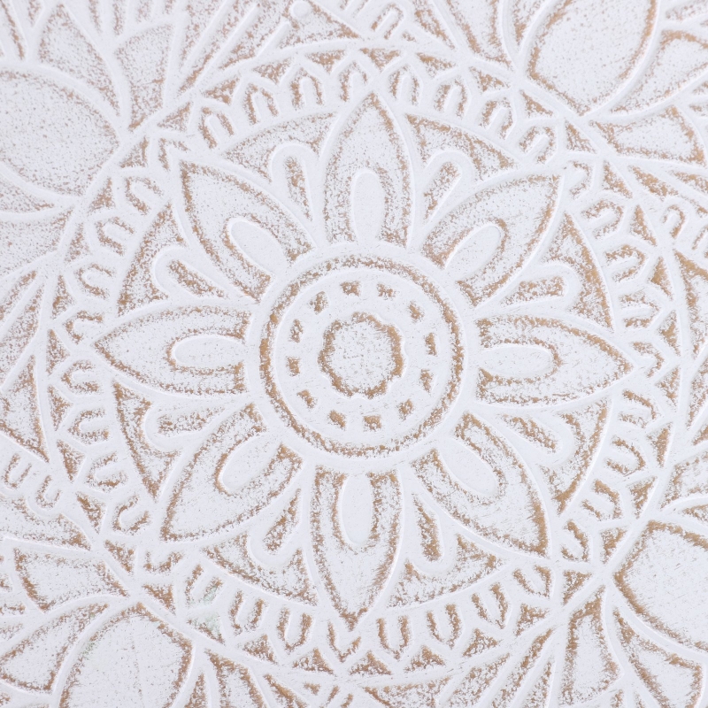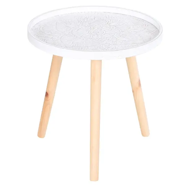 BEAUTIFUL SIDE TABLE: Great placed all over the home your living room, bedroom, balcony and hallway. || FLOWER SKETCHING: Indented on the bottom of the tabletop, the round coffee table creates a subtly striking look for an elegant touch all day long. || SAUCER TOP: Shallow yet spacious, the living room table provides a place to keep cups, books, magazines, keys and anything else on and close to you. Raised edges prevent items from falling off onto the floor. || THREE LEGS: Made from solid fir wood in a tripod shape to ensure balance and stability at all times. || DIMENSIONS: 40.5H x Φ40cm. || MAXIMUM LOAD WEIGHT 20KG. || EASY TO ASSEMBLE.